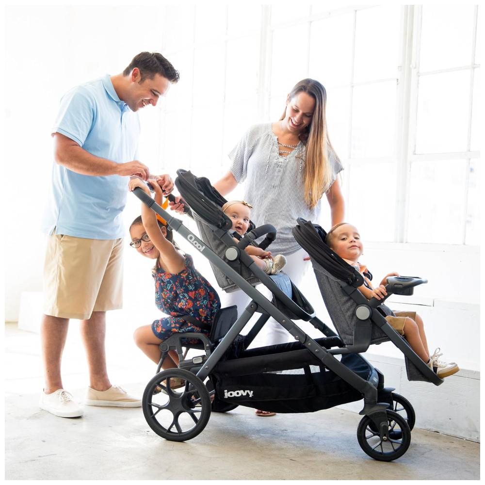 O carrinho de bebê Joovy Qool é um produto versátil, projetado para crescer junto com a sua família. Com capacidade para acomodar até três crianças, o carrinho apresenta melhorias em seu design, como a suspensão da roda traseira com absorção de choque, apoio para os pés ajustável e uma fivela magnética inovadora e fácil de usar. O guiador telescópico de um botão agora está protegido com tecido de couro, enquanto o cesto de armazenamento tem maior capacidade de peso e é mais fácil de alcançar.