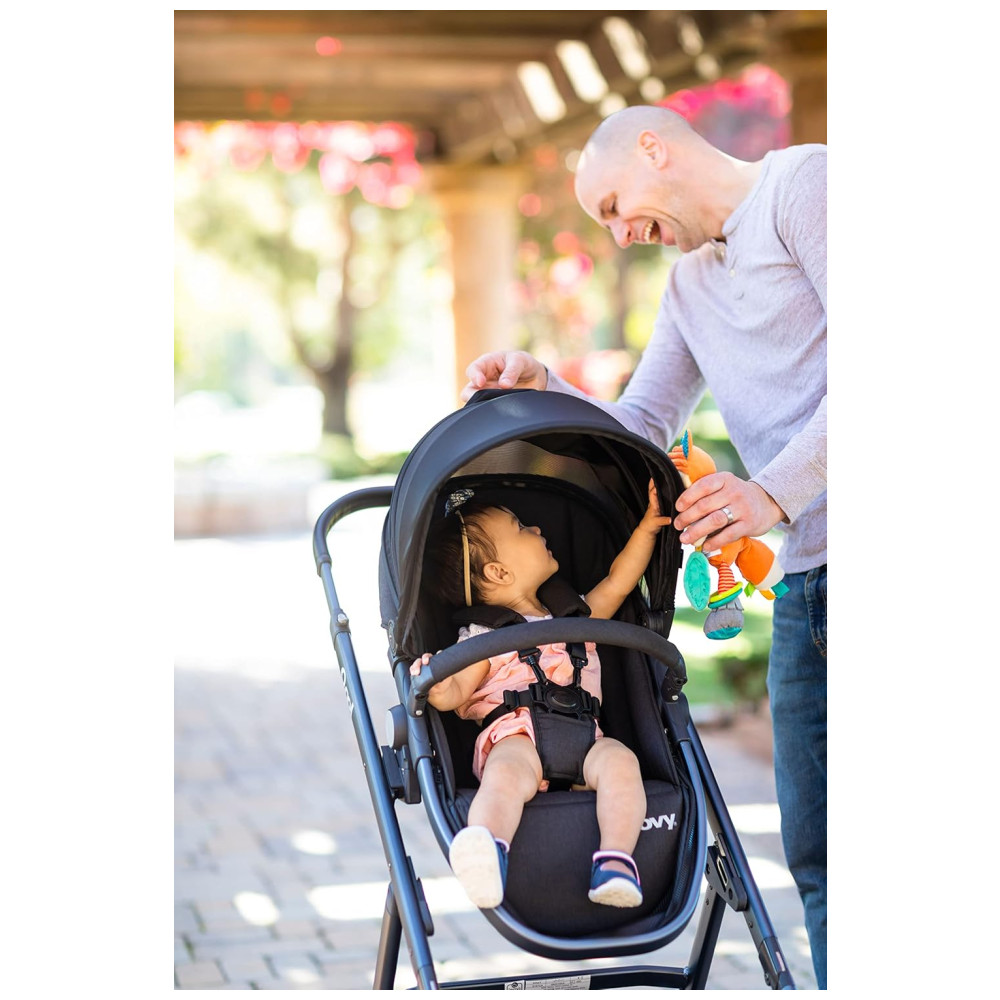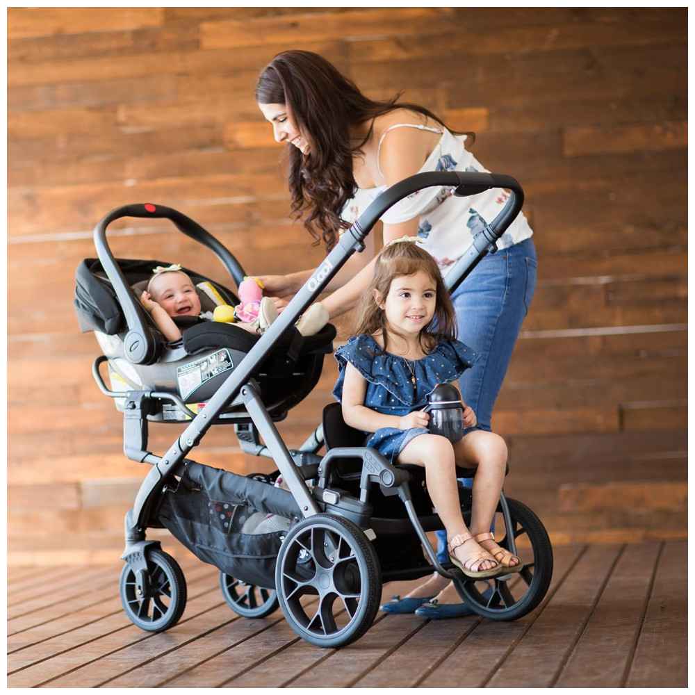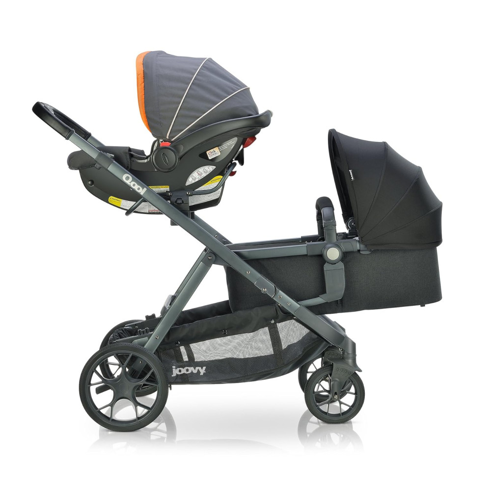 A bandeja de lanches swingopen com porta copos e organizador para os pais agora está incluída no carrinho joovy Qool. Cada assento pode suportar até 24,94 quilos e pode ser posicionado voltado para a frente ou para os pais em uma posição alta ou baixa na estrutura do carrinho. O dossel de proteção solar UPF 50 ajustável, a grande janela esconde esconde de malha, as rodas dianteiras giratórias e o assento reclinável multiposições são recursos adorados no Qool original.