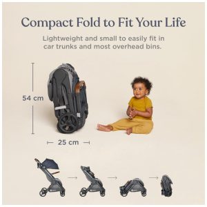Dobra fácil e compacta: pequeno o suficiente para caber na maioria dos compartimentos superiores de avião, armários e até mesmo nos carros menores, pesando 8,3 kg, 18,1 lbs. Tecidos premium, respiráveis e de qualidade selecionados para durabilidade e apelo luxuoso pensando em você e no bebê.