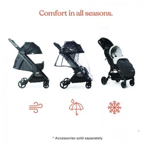 Acessórios incluídos: Inclui porta copos que se adapta às suas necessidades, barra de suporte em couro sintético que se dobra com o carrinho e proteção contra intempéries para proteger o bebê das intempéries