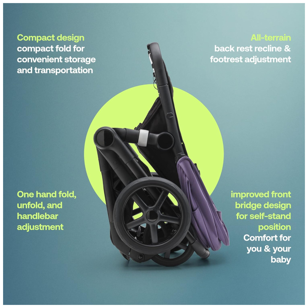 O carrinho é compatível com a maioria dos acessórios para carrinhos de bebê Bugaboo, como assentos de carro, prancha com rodas e suporte para berço.