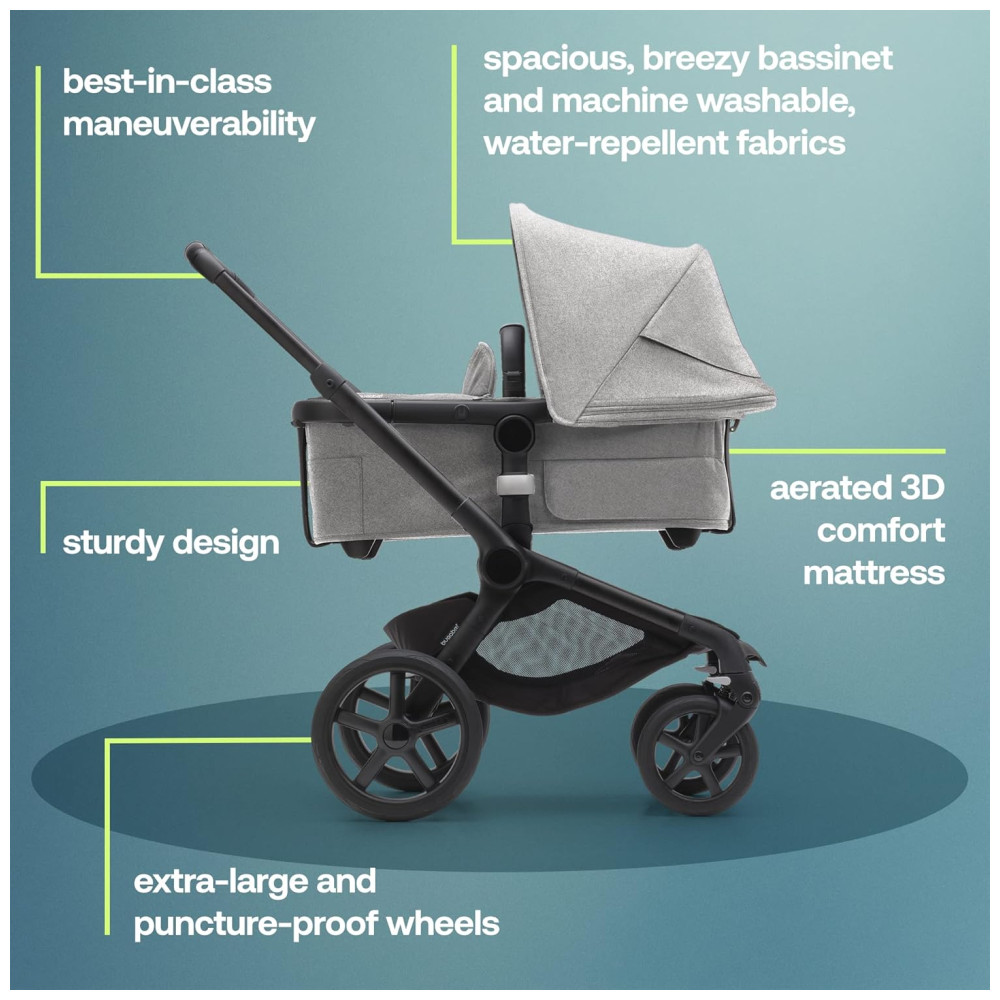 O carrinho é compatível com a maioria dos acessórios para carrinhos de bebê Bugaboo, como assentos de carro, prancha com rodas e suporte para berço.