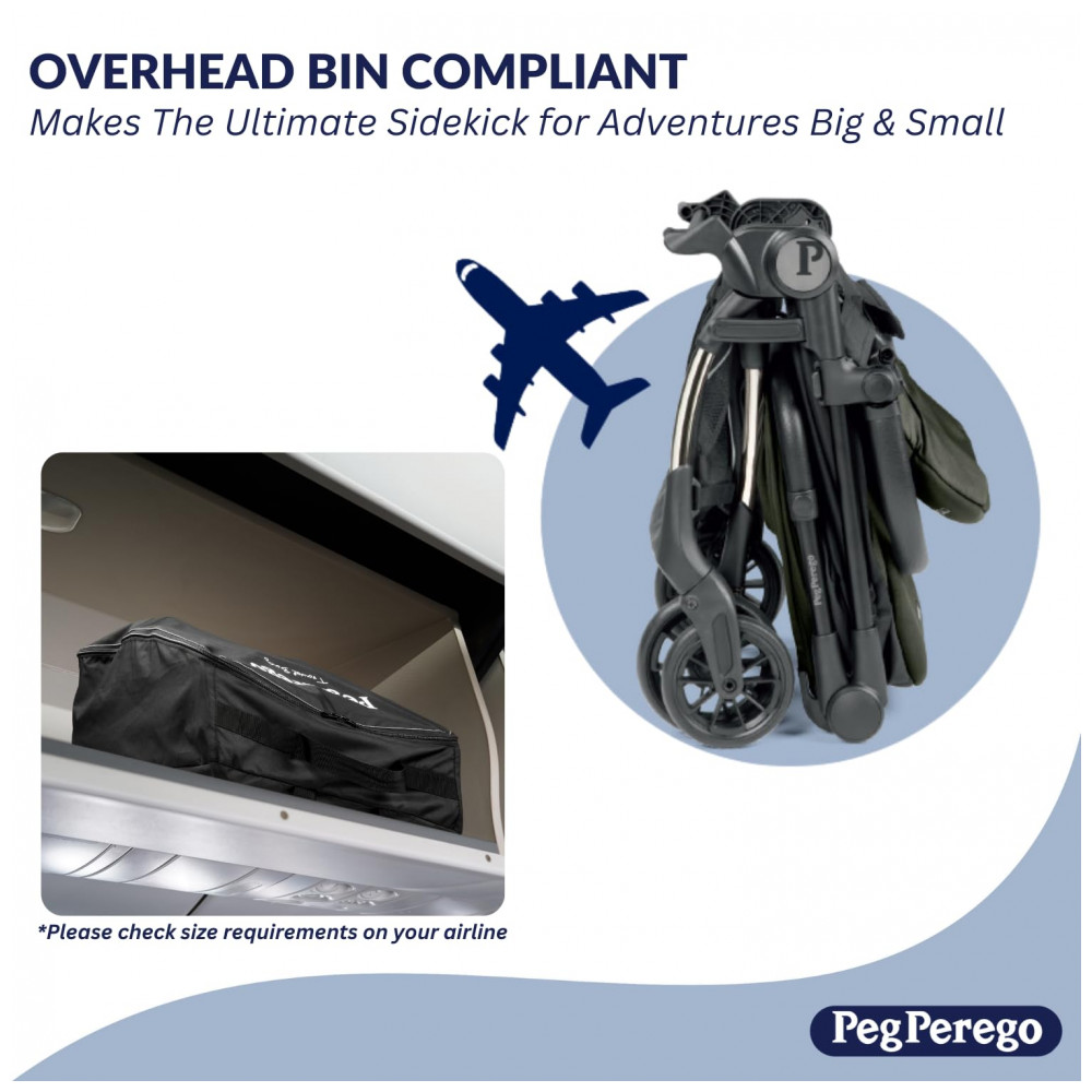 O design compacto conta com sistema exclusivo de dobra que o mantém em pé quando fechado, com dimensões de 44,5 x 25 x 50 cm, adequado para armazenamento em compartimentos superiores de aviões. A capota é extensível, confeccionada em tecido com proteção solar UPF 50+, protegendo contra raios UV e proporcionando maior conforto para a criança.