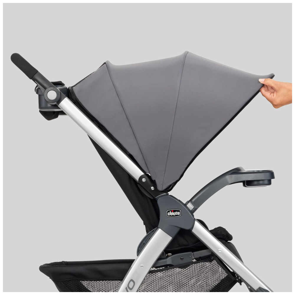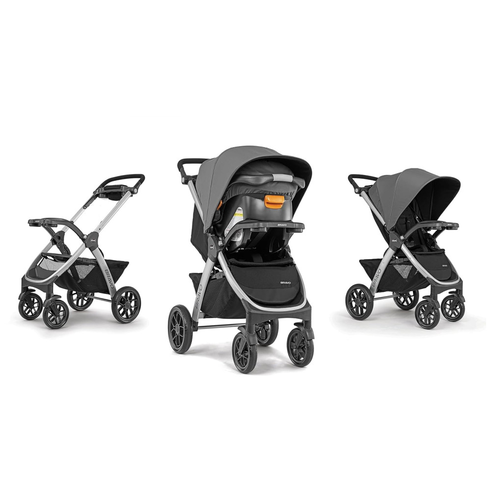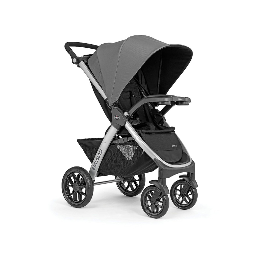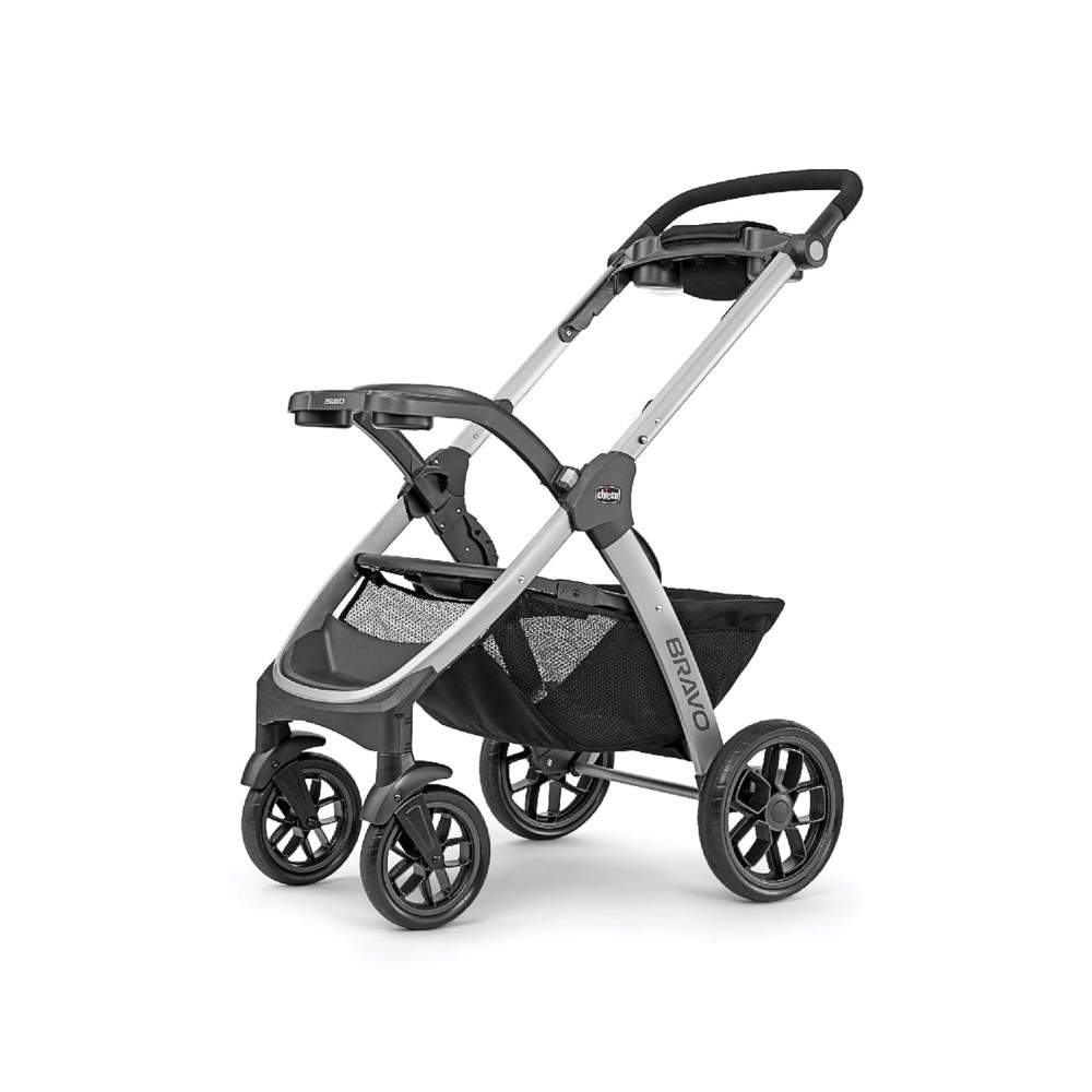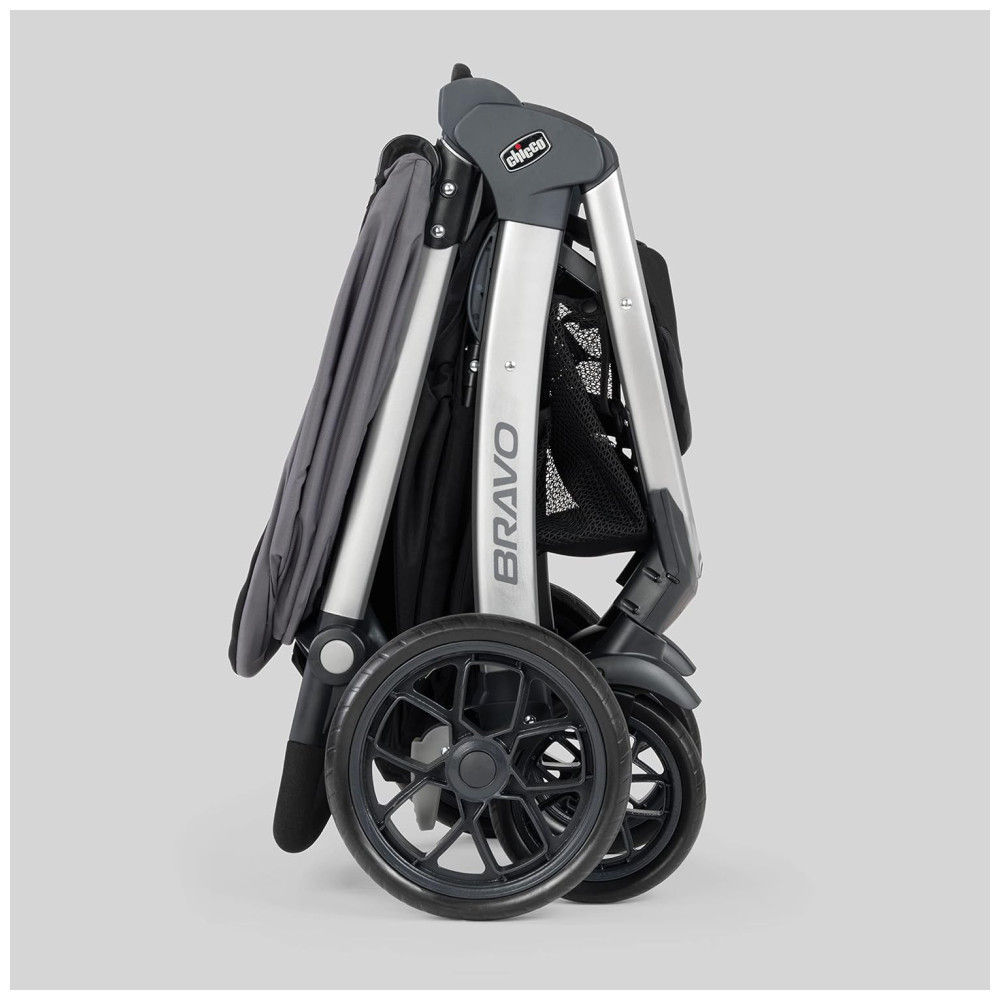 O assento e a cobertura removíveis transformam o Bravo em um porta assento de carro leve e oferecem fixação segura e de encaixe por meio da bandeja infantil. O design dobrável inteligente com uma mão é compacto e fica de pé de forma independente, sem que a alça toque o solo. O dossel UPFrated com janela de malha peekaboo, rodas grandes com pneus com banda de rodagem e uma grande cesta de armazenamento com acesso traseiro frontal e 2 bolsos organizadores completam este sistema de viagem.