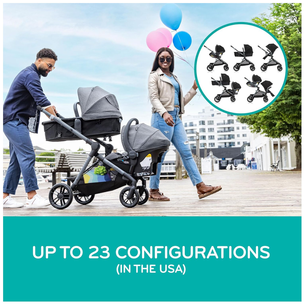 A estrutura do carrinho é projetada para máxima flexibilidade e pode acomodar até 23 configurações nos EUA para assentos de bebês e crianças pequenas em várias alturas, tanto no modo voltado para os pais quanto voltado para a frente. O dossel ajustável oferece três alturas para acomodar crianças de até 109 cm.