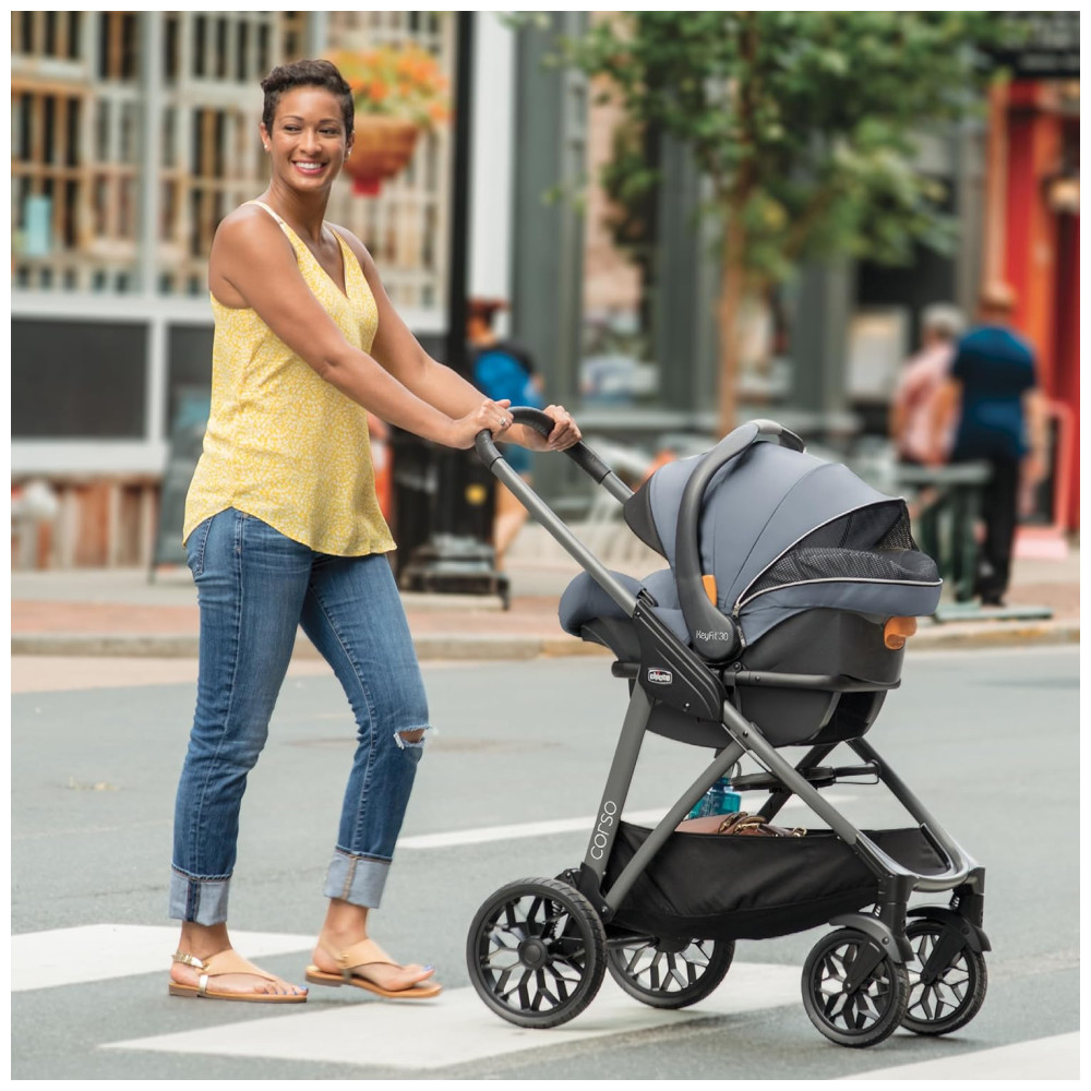 Com 4 configurações de passeio, tanto voltadas para os pais quanto voltadas para a frente, o carrinho de bebê e a cadeirinha de carro do sistema de viagem oferecem versatilidade e praticidade. E quando você precisar simplificar ainda mais a sua viagem, basta remover o assento do carrinho para converter o Corso em um porta assento de carro leve.