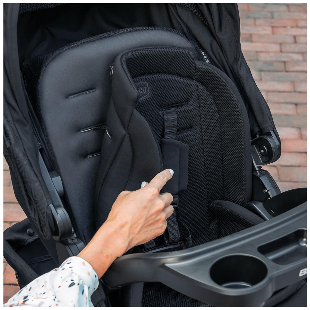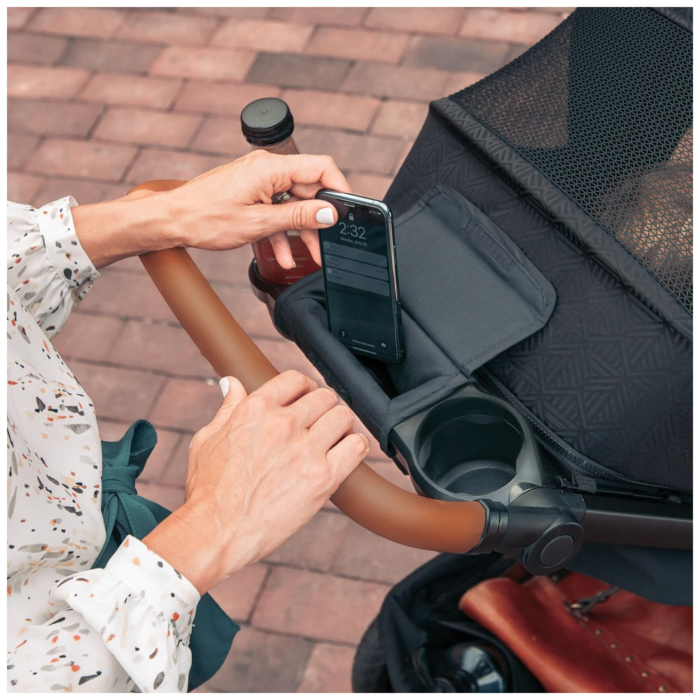O carrinho possui um assento reclinável multiposição de uma mão com malha zipopen de 3 posições, alça de empurrar em couro sintético contornada, almofada de assento reversível, capota UPF 50 com viseira removível e painel de malha completo e uma cesta de armazenamento para itens essenciais do bebê. Este é um par premium, poderoso e simplificado para a viagem infantil, com estilo e conforto para pais e filhos.