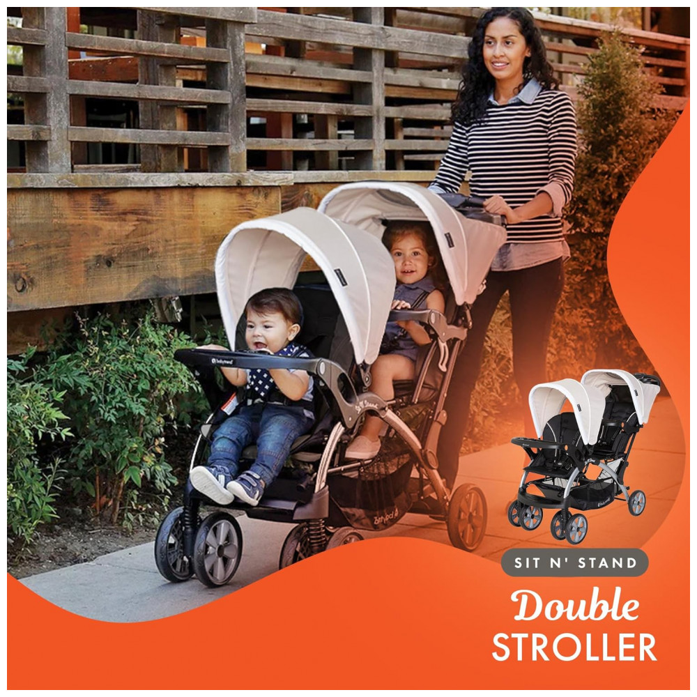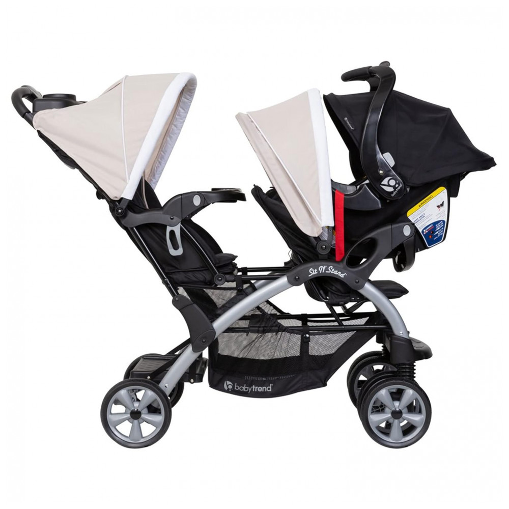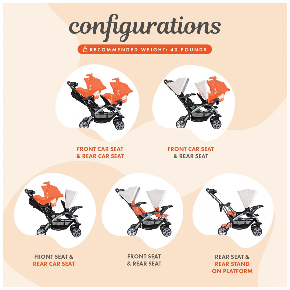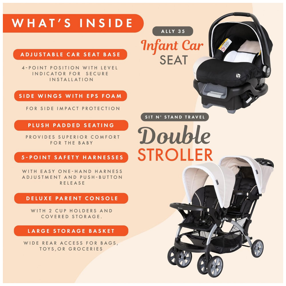 O carrinho duplo é compatível com o sistema de viagem e pode acomodar até dois assentos de carro para bebês, incluindo o assento infantil Baby Trend incluso.