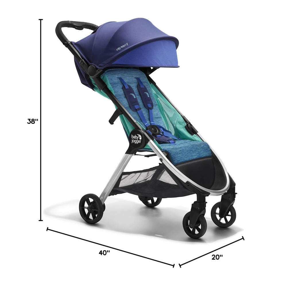 O Baby Jogger City Tour 2, Coastal é um carrinho de viagem ultracompacto e fácil de manobrar, pesando apenas 6,35 quilos. Com um design inspirado no oceano, o carrinho apresenta tecidos vibrantes em tons azuis, trazendo a sensação de um refúgio à beira mar para suas viagens. Além disso, possui painéis laterais de malha arejada feitos de 60% de tecido reciclado, proporcionando ventilação total para o bebê.