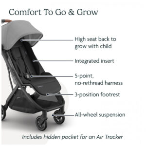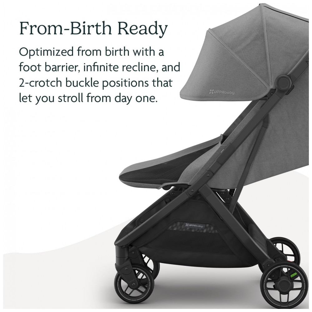 O carrinho UPPAbaby Minu V3 Greyson combina design leve em alumínio com assento em couro legítimo e tecido 100% poliéster, otimizando conforto e durabilidade. Projetado para crianças desde o nascimento até 23 kg, conta com assento reclinável infinitamente, apoio para pernas em três posições e barreira integrada para conforto e segurança. Sistema de arnês de cinco pontos ajustável. A suspensão dianteira e traseira independente proporciona passeio suave em diversos terrenos. A capota extensível com proteção solar UPF 50+ e janela em malha garante ventilação e proteção contra intempéries. Compacto e aprovado pela IATA, pode ser facilmente transportado em compartimento de bagagem de cabine, com alça integrada para transporte. Inclui cesto inferior com capacidade para até 9 kg. Produto com certificação GREENGUARD Gold para baixa emissão de químicos.