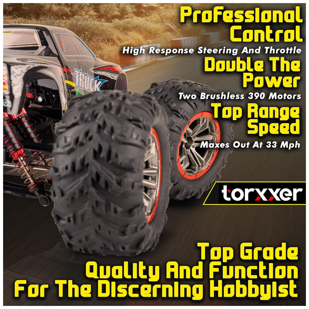 Agarre e rasgue poder não significa nada sem aderência. Leve este caminhão de controle remoto 4×4 offroad com pneus de borracha de PVC que oferecem grande mordida na rua ou na trilha. A tração nas 4 rodas e a direção de precisão também evitam que este caminhão fique preso.