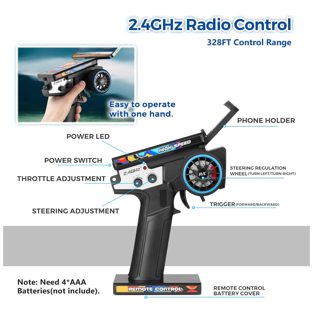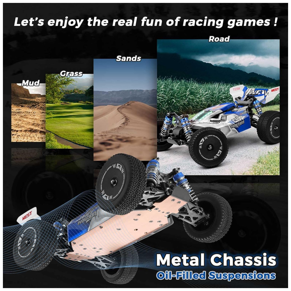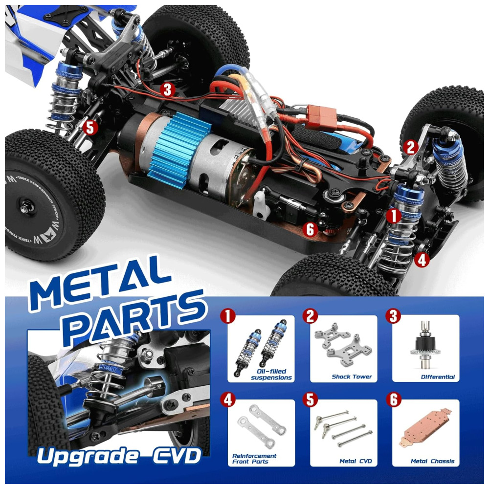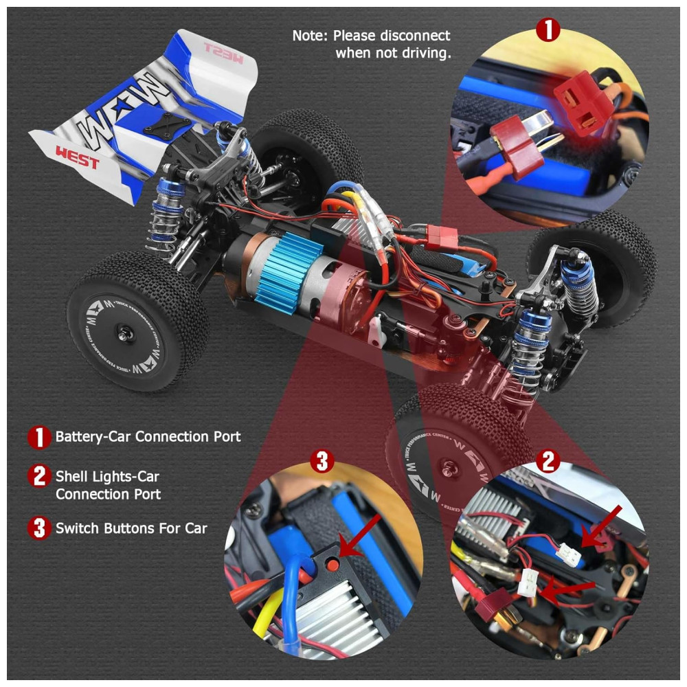 Quando a energia estiver baixa, todas as luzes piscarão e o carro com controle remoto desligará automaticamente após 30 segundos. O chassi de metal CVD e as suspensões metálicas cheias de óleo melhoram a durabilidade do carro. O diferencial de metal, torre de choque de metal e chassi de alumínio garantem uma dissipação de calor mais rápida.