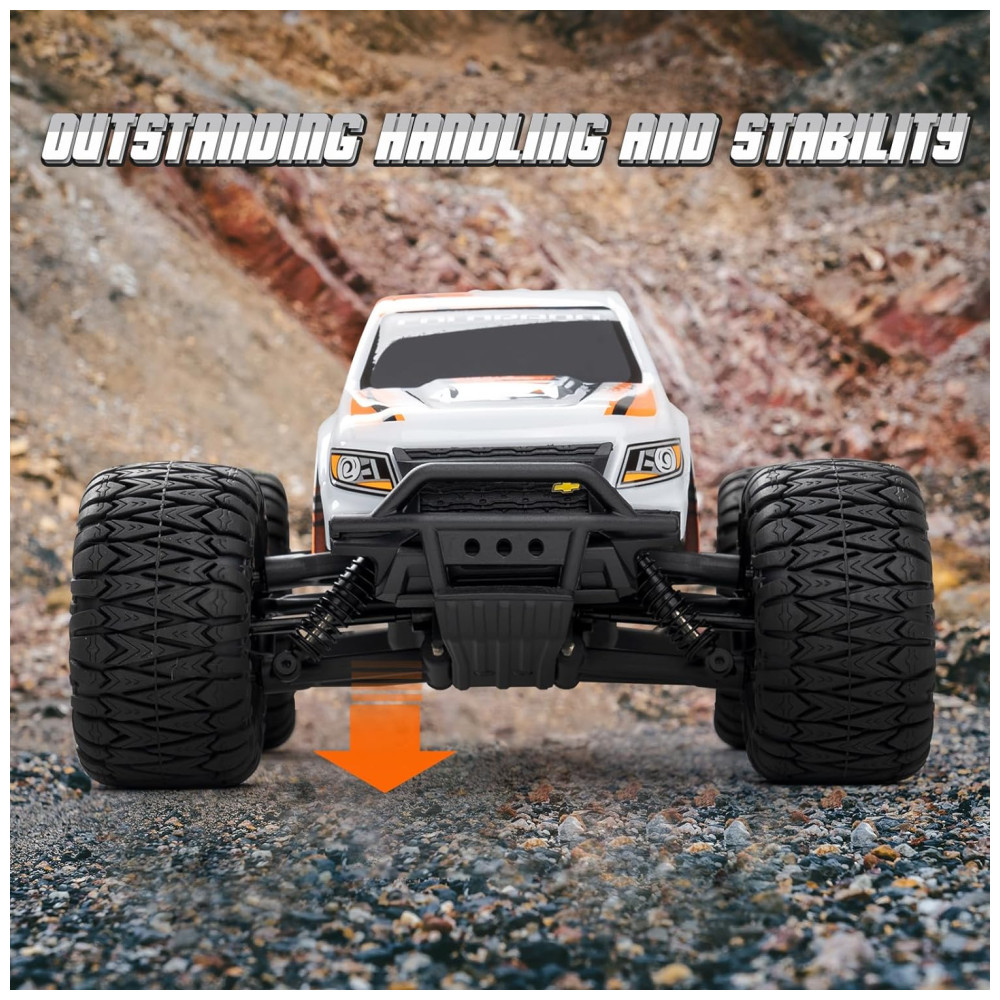 Este é um Monster Truck RC com uma carroceria Chevrolet oficialmente autorizada, disponível em 3 cores diferentes e com decalques que melhoram a aparência e a identificação do veículo. A carroceria é feita de nylon de alta resistência, o que aumenta a durabilidade do carro RC e reduz o impacto ambiental, já que os materiais são recicláveis e ecologicamente corretos.