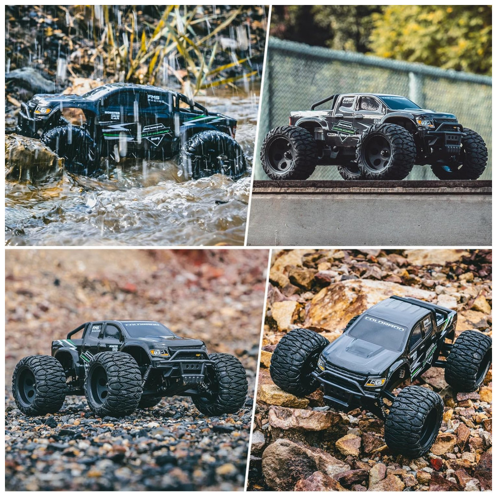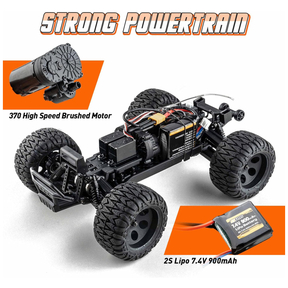 O motor escovado 370 de alto desempenho distribui a potência de forma eficiente aos eixos dianteiro e traseiro através de um eixo de transmissão universal para transmissão adaptável. O carro RC offroad possui pneus ocos de grandes dimensões para capacidades offroad aprimoradas, proporcionando tração e aderência em vários terrenos.