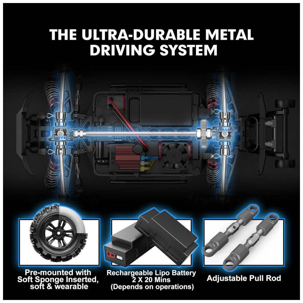 Transmissão Durável e Eficiente: Com engrenagens metálicas e diferencial metálico, este carro distribui a potência de forma eficaz para alcançar um 4WD perfeito. O eixo de 5, de diâmetro e as porcas M4 contribuem para a durabilidade, e os 16 rolamentos de esferas proporcionam uma condução suave e reduzem a perda de potência.