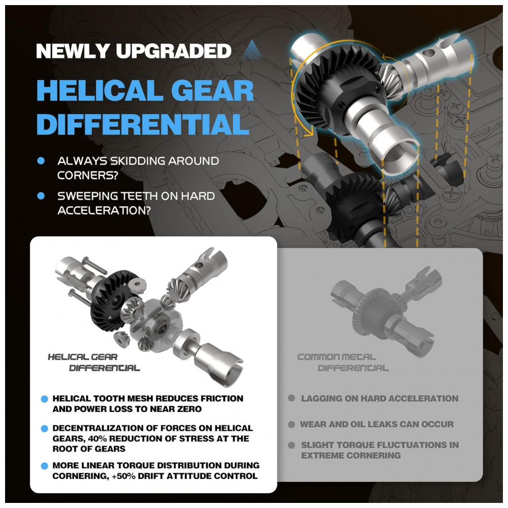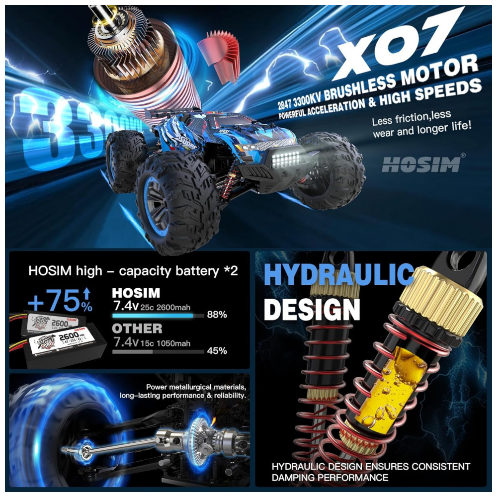 Motor sem escova 2847 e ESC sem escova 45A: Este veículo é equipado com um motor poderoso de 2847, que permite atingir uma velocidade máxima de 68 km, h 40 mph. Além disso, possui um controlador eletrônico de velocidade ESC sem escova de 45A projetado para oferecer máxima conversão de energia. Ele suporta uma bateria 3S 11,1V no máximo bateria de 7,4V 11,1V.