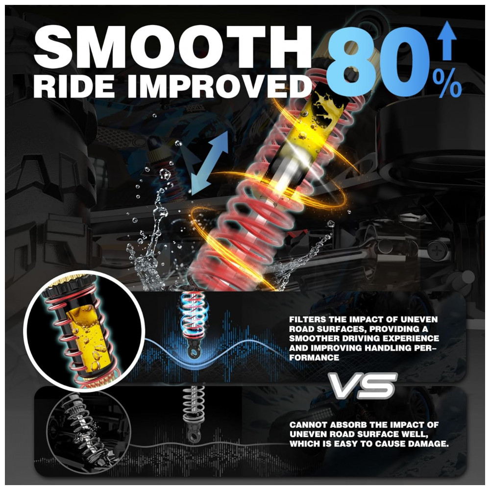 Choques de Óleo Atualizados e Engrenagem Diferencial Atualizada: Quatro amortecedores cheios de óleo de alumínio e quatro rodas resistentes permitem que você conduza o veículo em diversos terrenos, incluindo areia, deserto, rochas íngremes de até 45 graus, poças e grama. A estrutura de engrenagem diferencial de metal atualizada melhora o desempenho e a durabilidade do buggy.