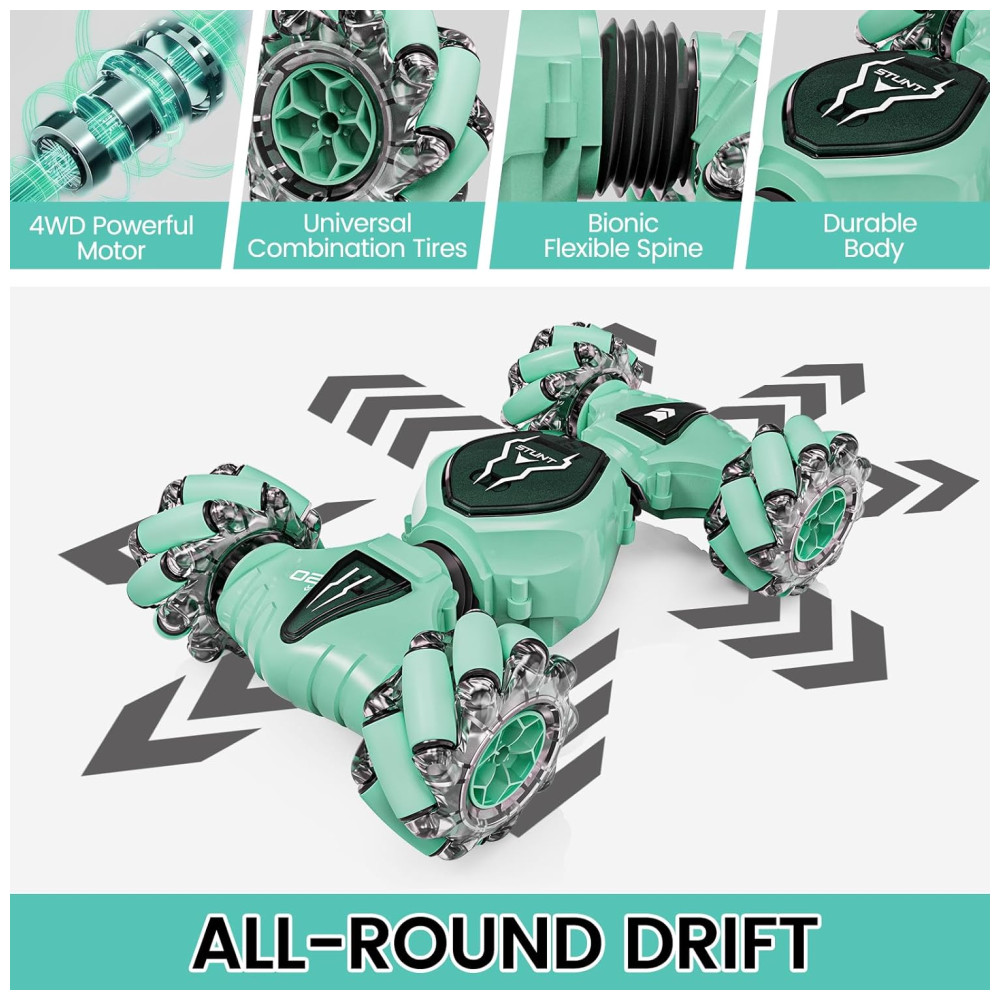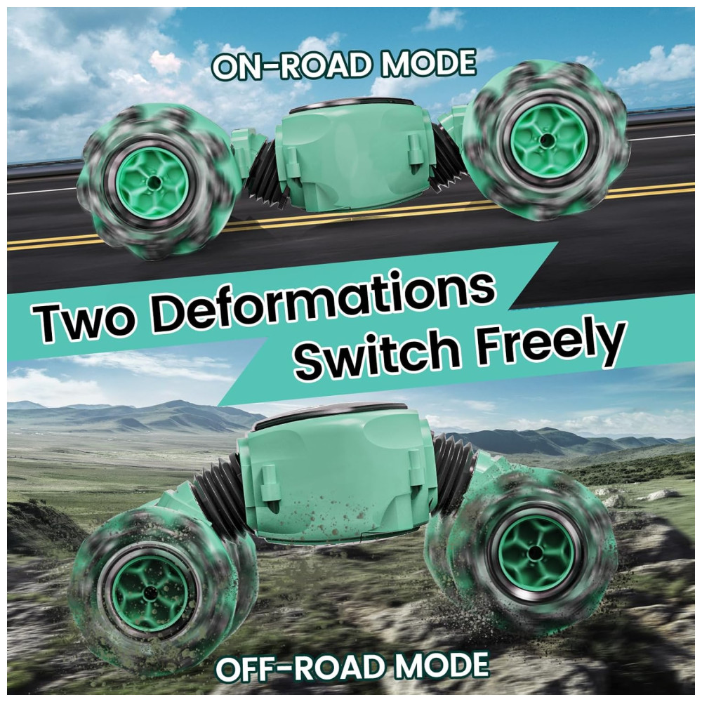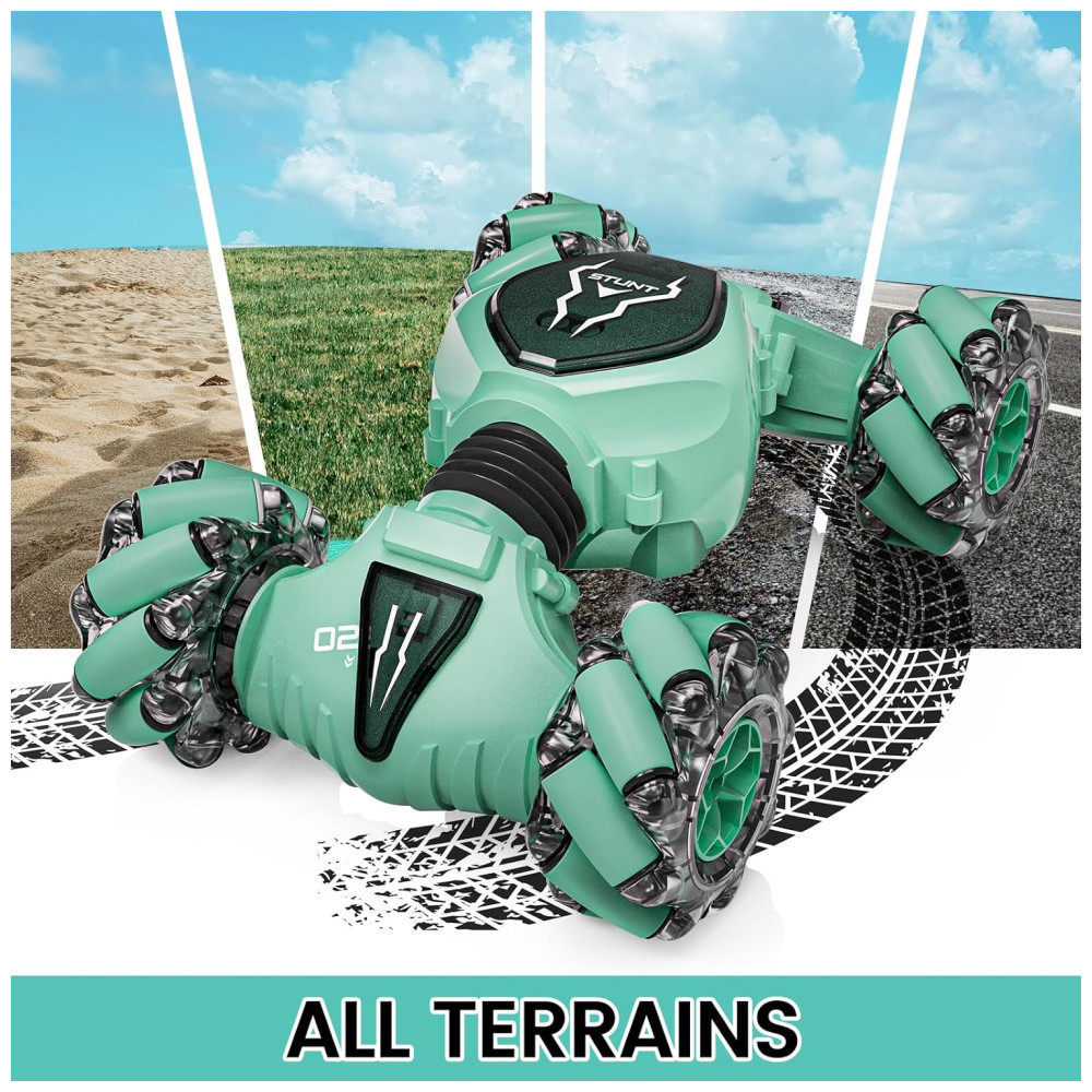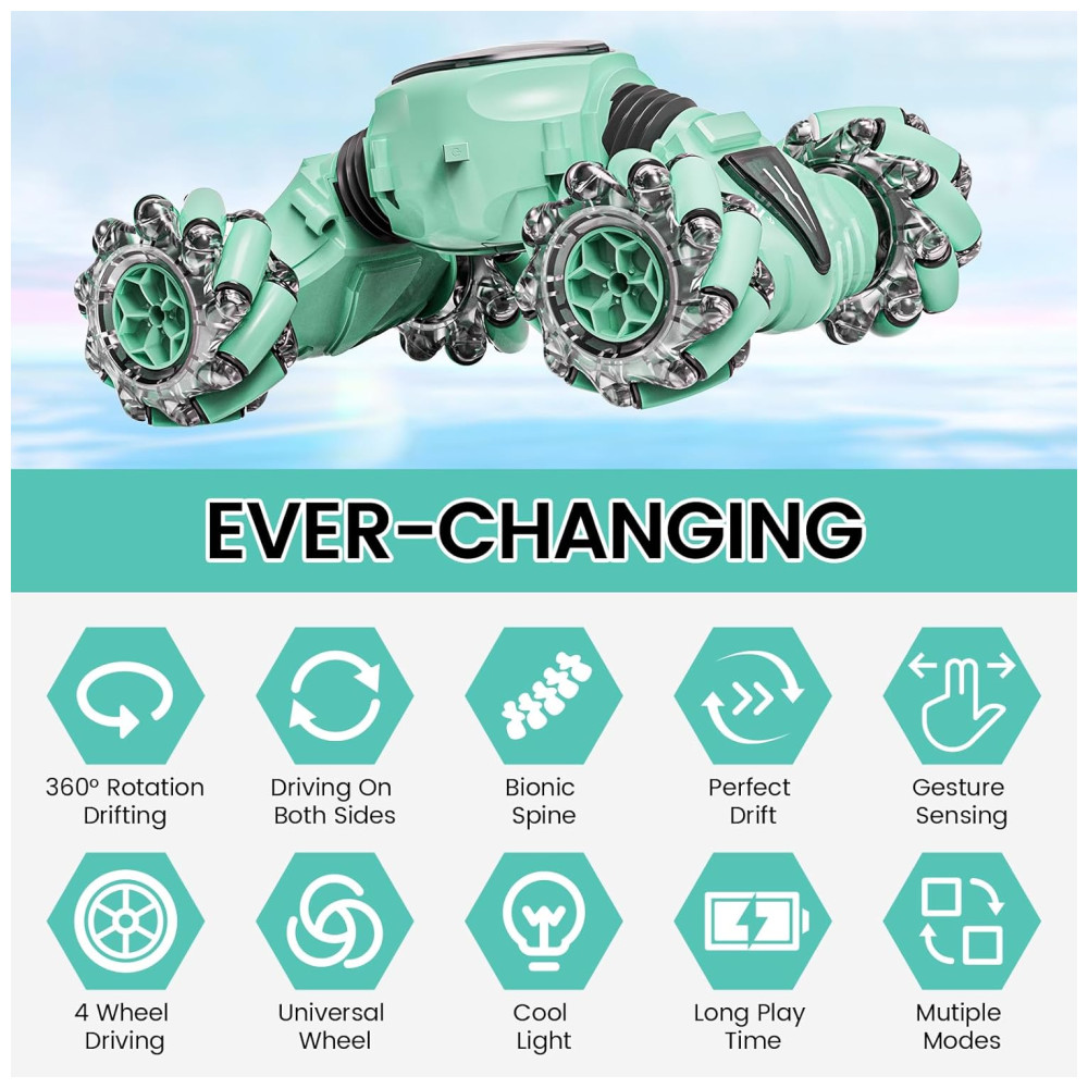 Este carro de controle remoto por gestos é um veículo de acrobacias versátil, capaz de se mover em todas as direções e flutuar em todas as direções, girar 360 graus, torcer e deformar, além de alternar livremente entre os modos rodoviário e offroad. É muito adequado para todos os terrenos, como areia, grama, solo, pedras, etc.
