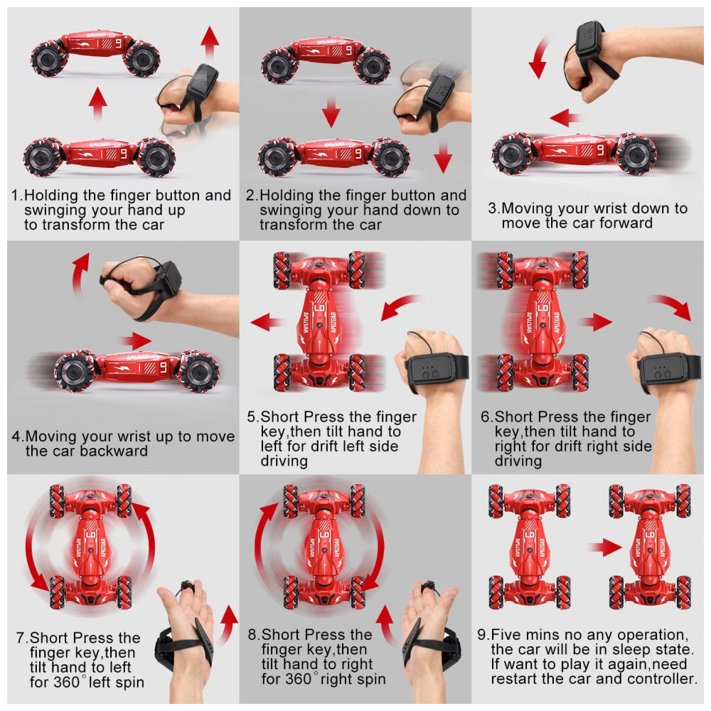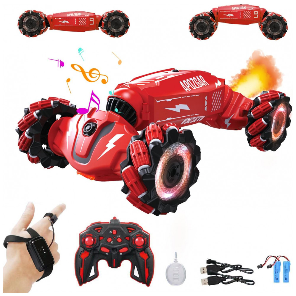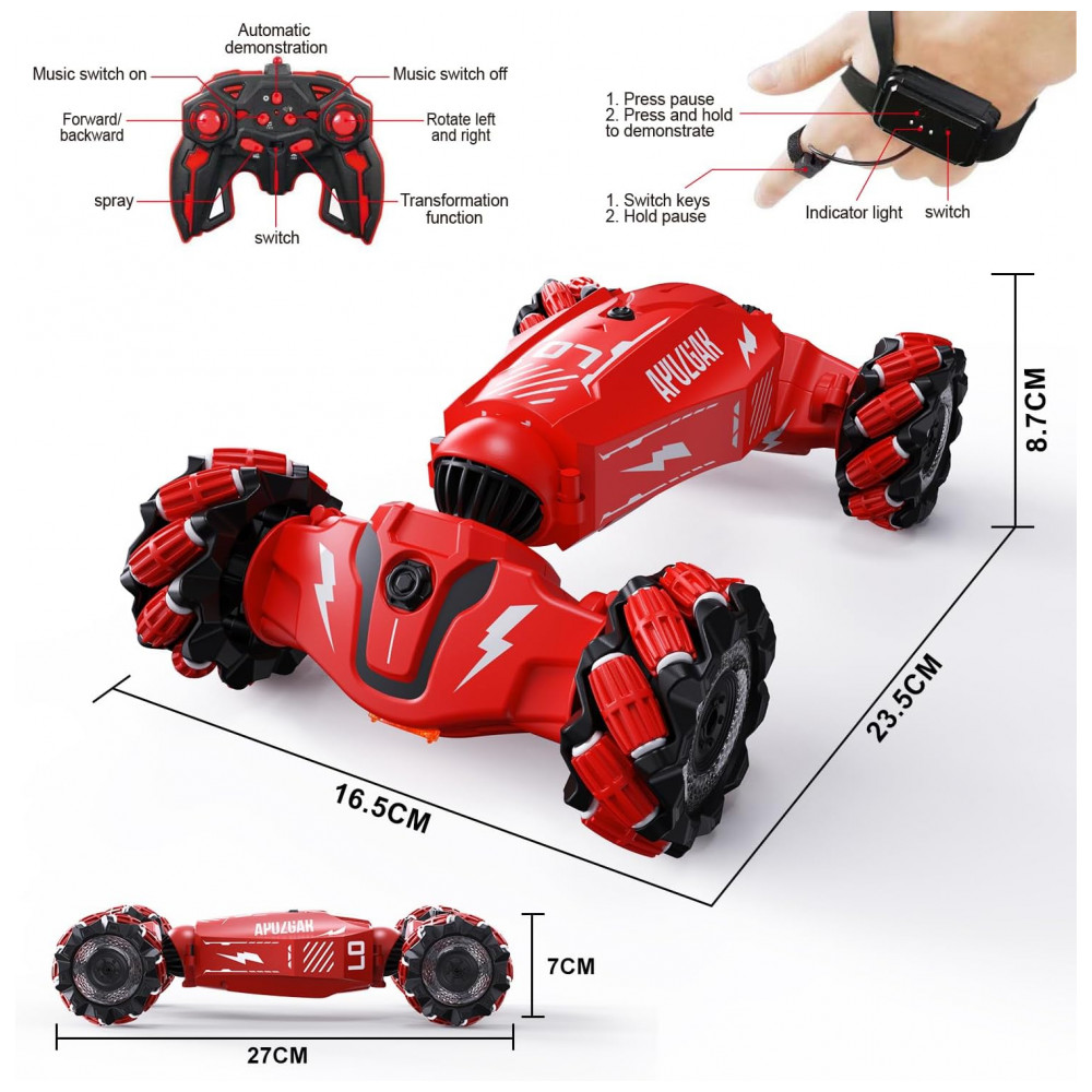 Carrinho de Controle Remoto e Sensor de Gestos com Rotação 360 Luzes Música e Névoa em Spray LOOZIX Vermelho