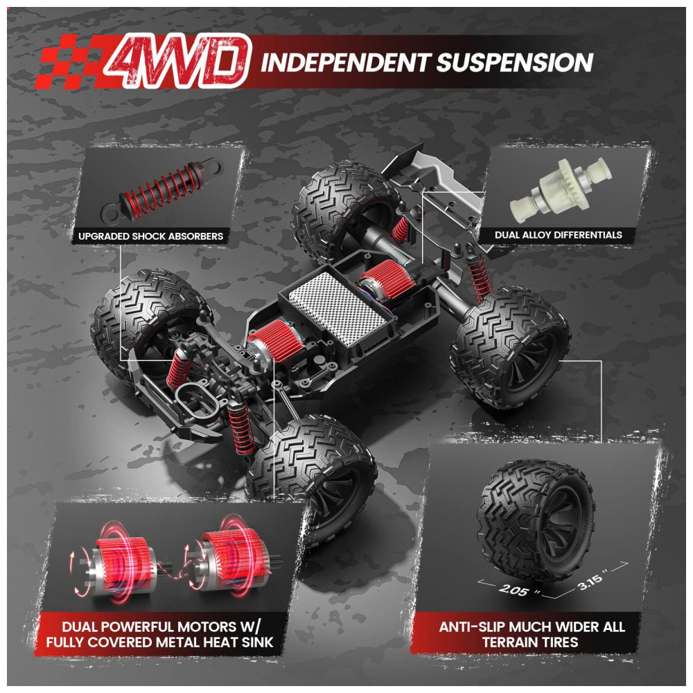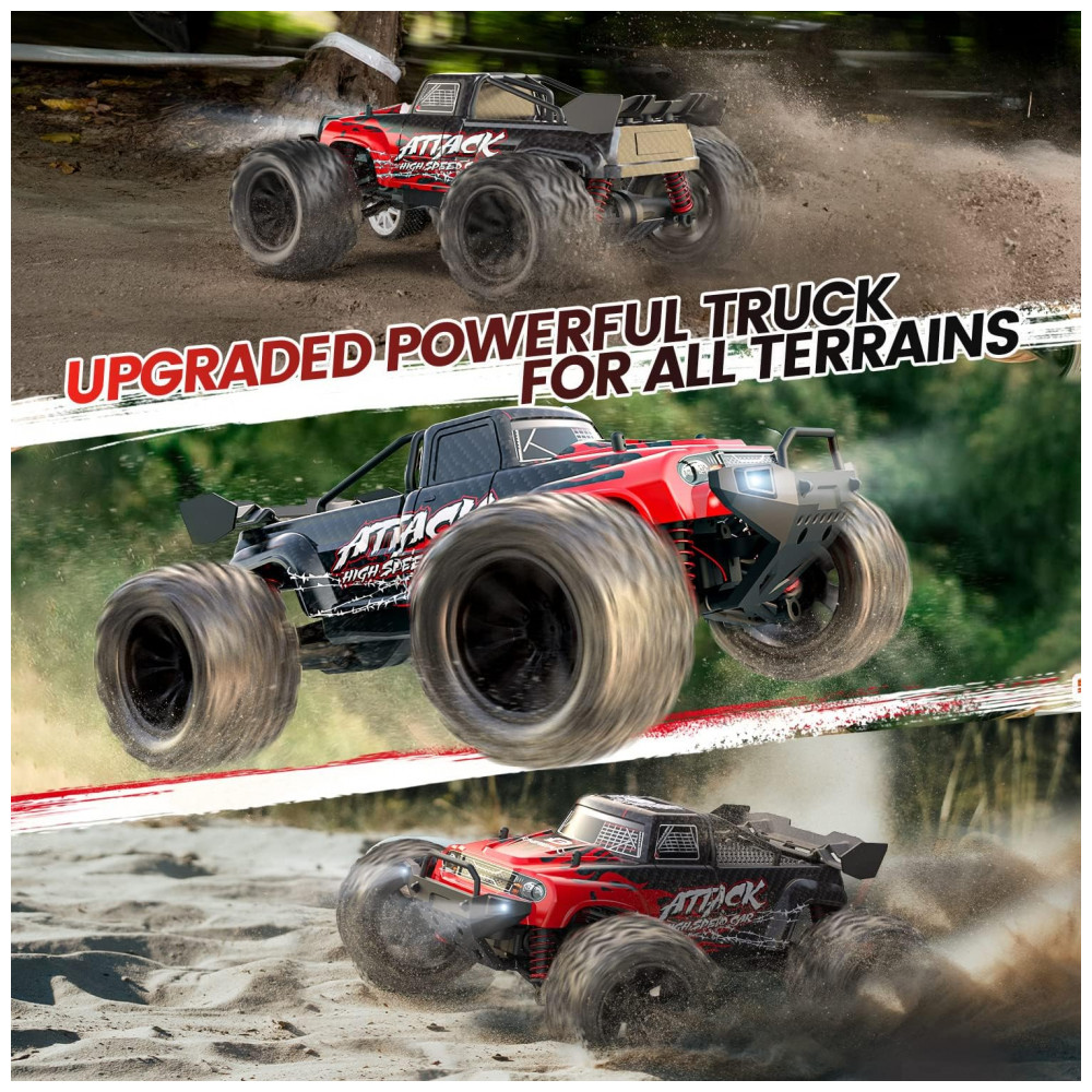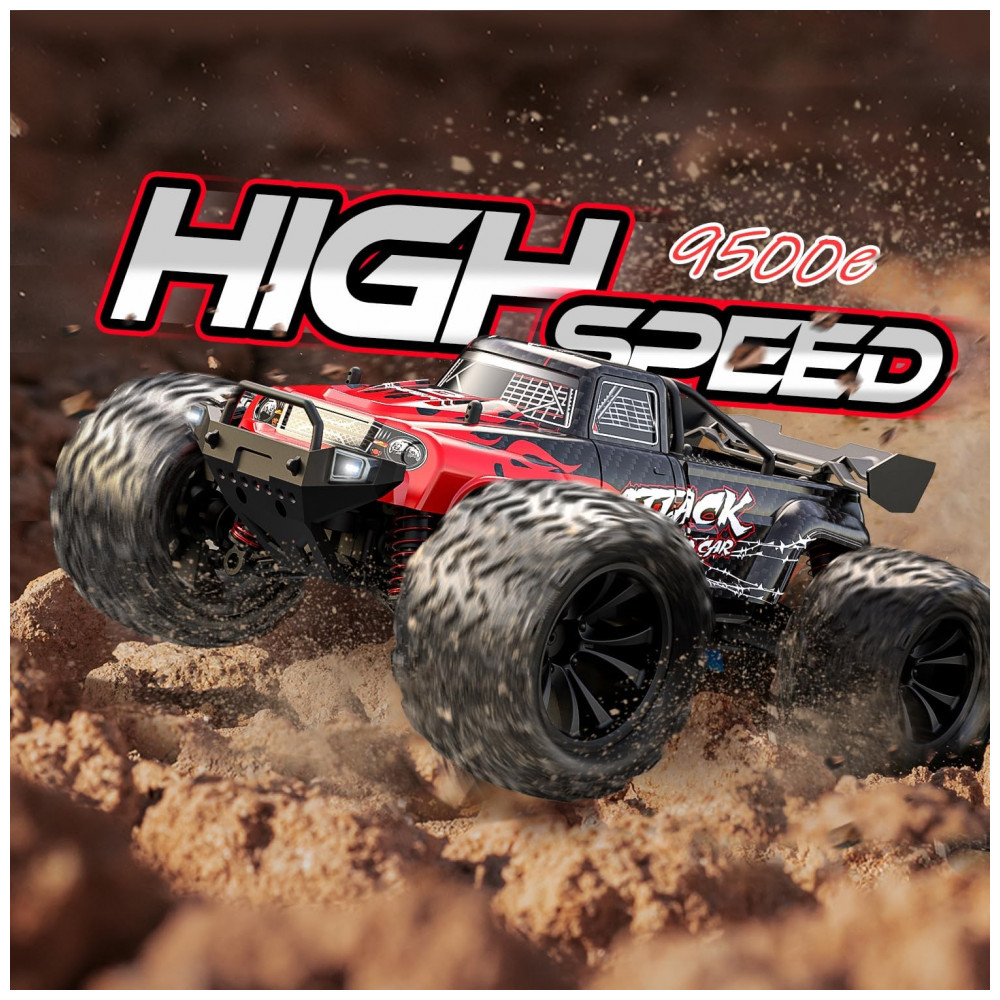 4WD All Terrain Monster Truck Este caminhão de controle remoto legítimo está equipado com chassi de carro de nylon premium e elástico extremamente durável. Com motor de direção tenso de 1,8 kg, servo de alto torque e direção e acelerador proporcionais, este carro rc hobby é capaz de conquistar terrenos muito mais difíceis e permitir que este veículo off road viaje livre e facilmente em estradas irregulares. O design à prova de respingos e rodas mais largas para serviço pesado permitem que você dirija o carro de controle remoto em todos os terrenos, como praia, areia, rocha ou estradas de concreto ect.