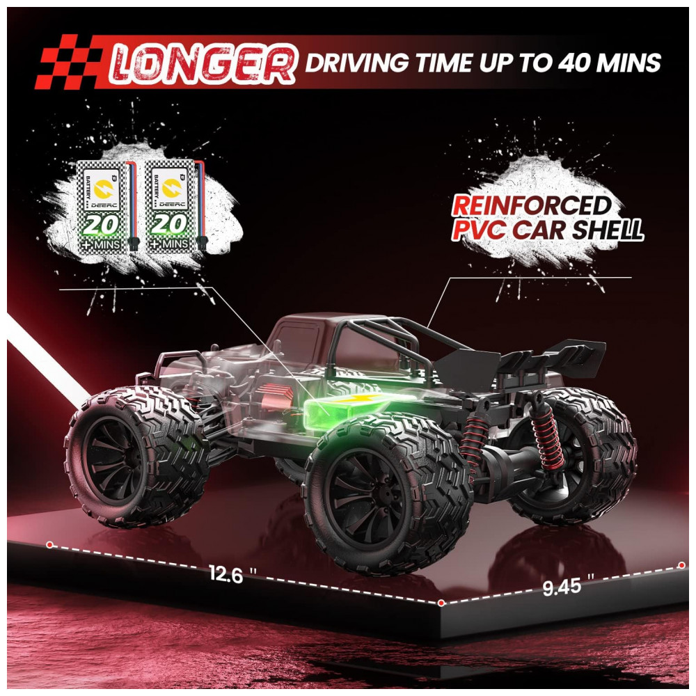 Motor poderoso duplo para super velocidade Os motores duplos embutidos fornecem grande potência, proporcionando emoção de corrida de alta velocidade de mais de 40 km , h. O motor poderoso também fornece essa capacidade de escalada de caminhão monstro rc. Ele pode subir em declives de 50 graus sem esforço.