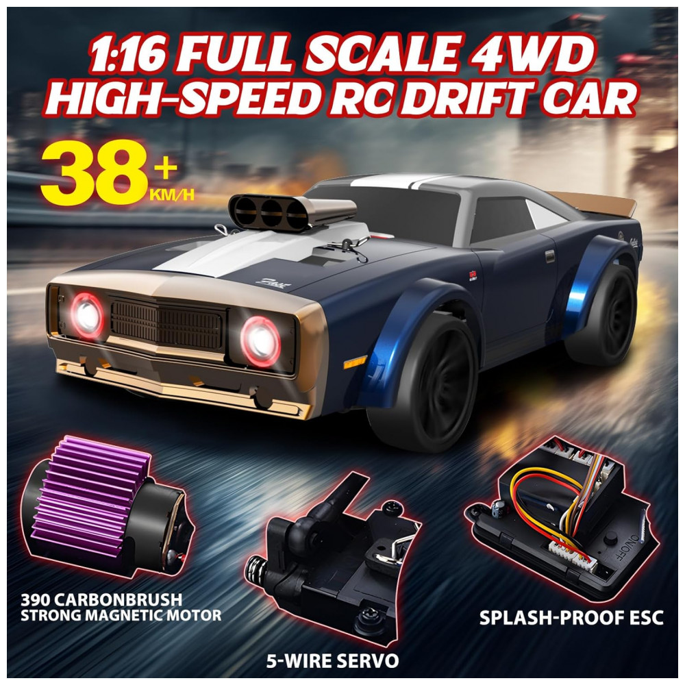 Carrinho de Controle Remoto Escala 1:16 com Velocidade até 38 km/h Luzes LED e Unidades de Baterias Recarregáveis Desdoni Drift Azul Escuro