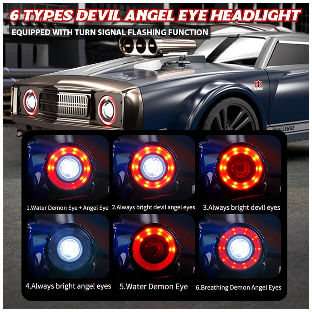 O carro de drift com controle remoto vem equipado com 6 modos de luzes LED, incluindo faróis projetados com olhos de anjo e demônio, e o formato do arco é habilmente combinado com 6 modos de luz. As luzes também possuem função de pisca de direção, com 6 funções de modo olho de anjo de demônio de água, olhos de anjo demônio sempre brilhantes, olhos de demônio sempre brilhantes, olhos de anjo sempre brilhantes, olho de demônio de água, olhos de anjo demônio respiratórios. O design das luzes LED torna o carro ainda mais deslumbrante no escuro.