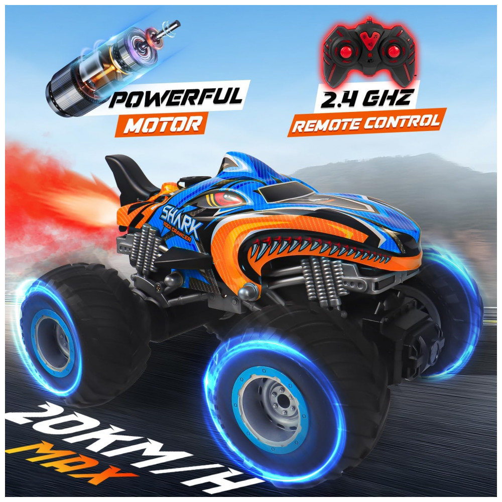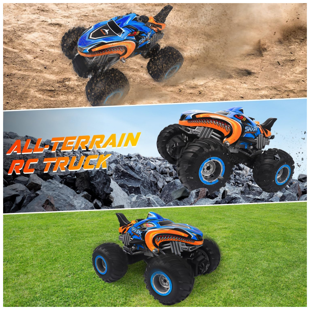 Carro de corrida sem interferência de 2,4 Ghz O caminhão de brinquedo é equipado com controle remoto sem interferência fácil de usar com frequência de 2,4 GHz, deixando o carro sempre pronto para correr e com função sem interferência. A distância de controle de rádio é de cerca de 260 pés, não se preocupe em executar esses carros de controle remoto em pastagens, areias e terrenos acidentados.