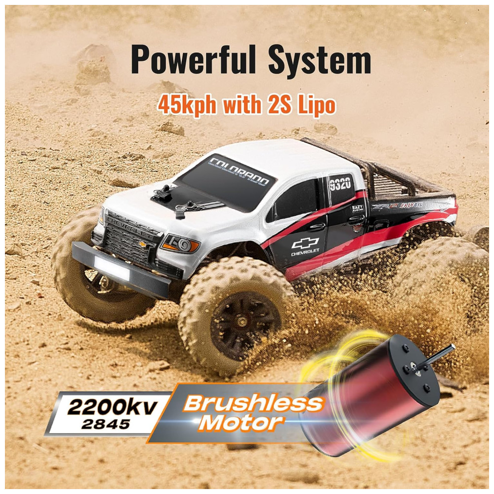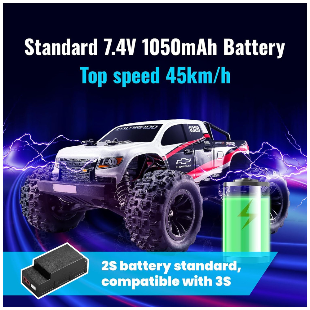 O motor sem escova de ampla potência, a bateria de 1050mAh 45A ESC 2845 4200KV, o motor de alto torque de 4 polos oferece entrega de energia eficiente e funciona excepcionalmente bem para este carro off-road em alta velocidade. A bateria de 1050mAh fornece energia contínua. A combinação de motor sem escova de alto torque e bateria libera velocidades de 45 km/h.