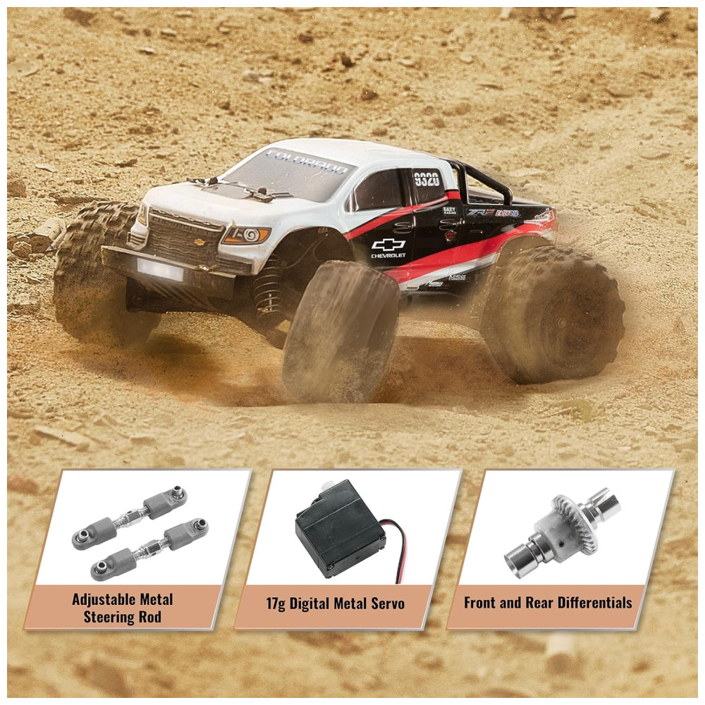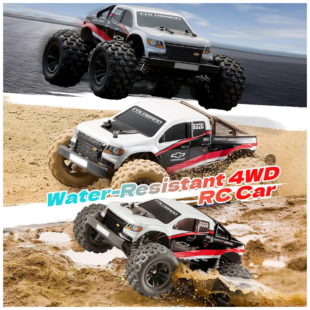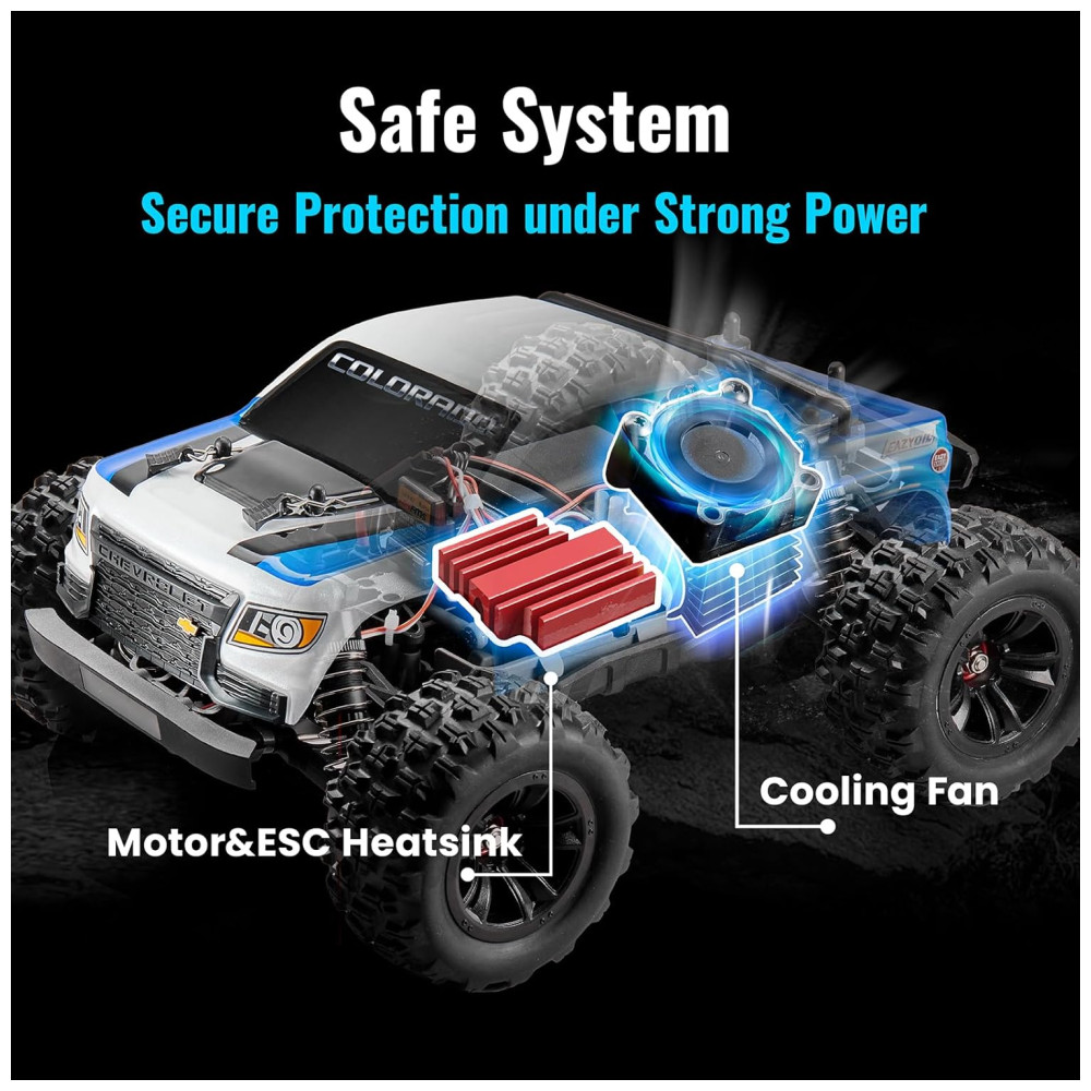 Com resistência a perfurações e anticolisão, este hobby RC garante durabilidade. Com um dissipador de calor de metal de alta qualidade e um ventilador de resfriamento eficiente, o caminhão RC tem um desempenho ideal mesmo sob potência intensa. A classificação à prova d’água IPX5 protege o receptor independente e o ESC 45A, permitindo brincadeiras emocionantes em ambientes úmidos, NÃO para submersão total.