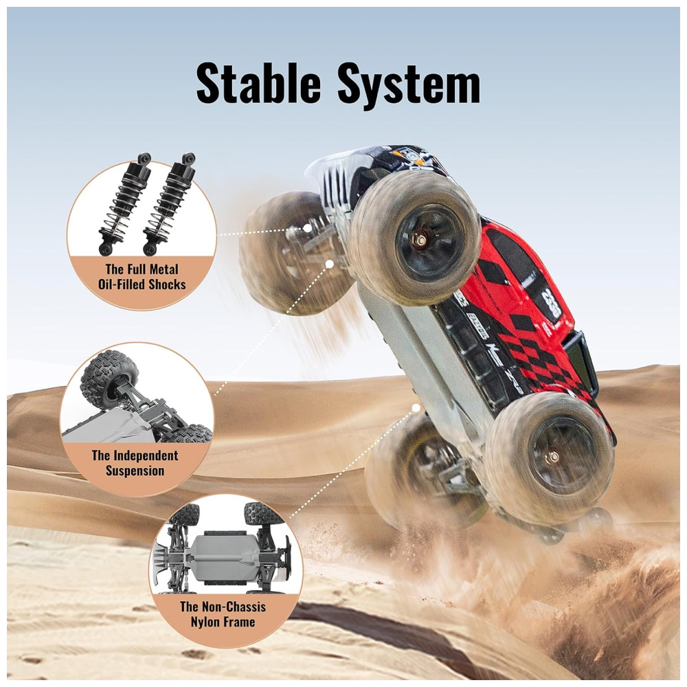 O chassi robusto, mais suave e estável, placa inferior reforçada e engrenagens totalmente metálicas tornam este caminhão RC off-road incrivelmente forte. Dezesseis rolamentos de esferas de alta qualidade no carro RC maximizam a eficiência da transmissão. Os pneus de alta aderência com piso assimétrico proporcionam uma condução emocionante. Direção ajustável garante controle preciso. Amortecedores preenchidos com óleo Fullmetal garantem estabilidade durante saltos de alta velocidade. Este caminhão RC lida com todos os terrenos suavemente, sejam rochas ou colinas.