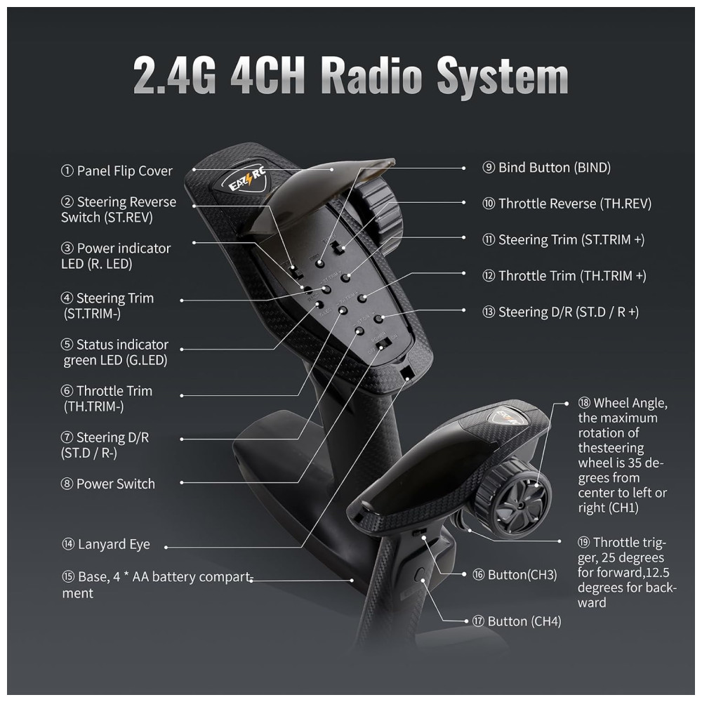 Com um sistema de controle digital 4CH 2,4 GHz e receptor independente, este carro RC garante um controle conveniente e preciso. CH4 controla efeitos de iluminação, enquanto CH3 permite modificações no jogador. Acessórios de atualização estão disponíveis na Amazon. Ele se destaca em corridas curtas, saltos, cambalhotas e acrobacias com seu motor potente, recursos de segurança e sistema estável. Adequado para iniciantes e entusiastas experientes, este caminhão 4×4 RC garante diversão e emoção sem fim.