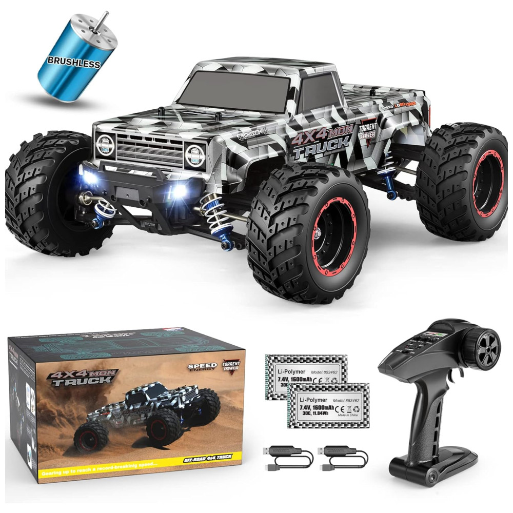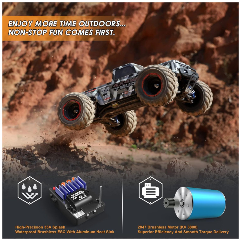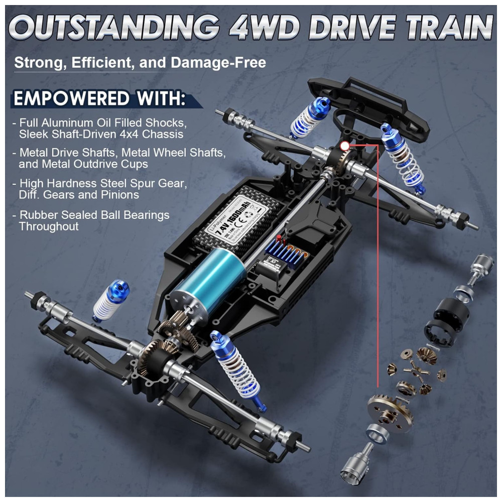 Este carro RC off road possui um motor 2847 sem escovas de 3800KV, pinhões de aço, amortecedores de óleo de alumínio e eixos de transmissão de metal. O chassi com motor posicionado na linha central permite equilíbrio de peso e manobrabilidade estável. Todas as peças de direção foram atualizadas para peças de metal. O sistema de controle de rádio de 2,4 GHz tem um alcance de controle de mais de 100,3 metros, permitindo competir com muitos carros de corrida sem interferência de sinal.