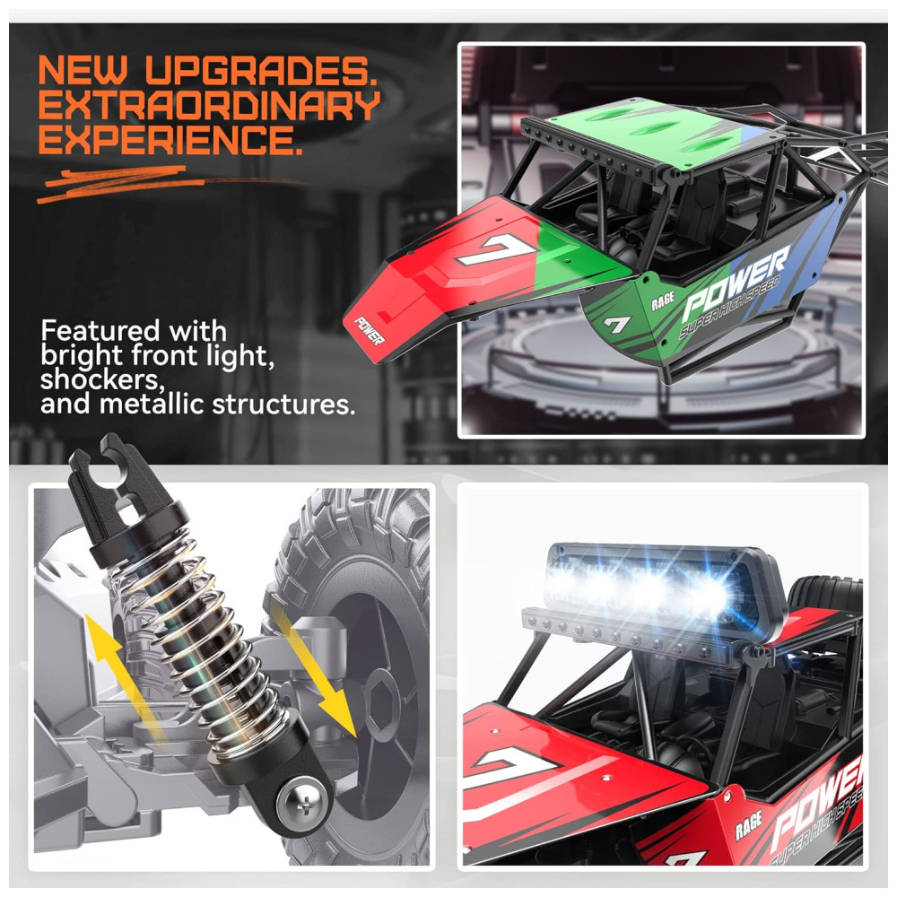 CHASSIS EM ABS E QUADRO DE CORPO REFORÇADO Todo o chassis do carro de controle remoto é feito de plástico ABS e o corpo principal é feito de material de liga de alumínio. Todas estas propriedades conferem ao camião uma melhor resistência à colisão para prolongar a sua vida útil.