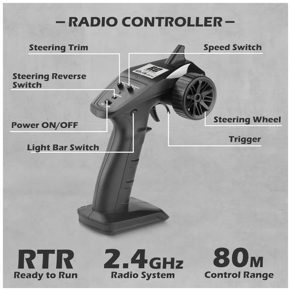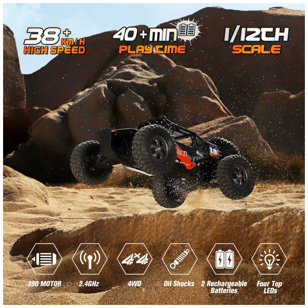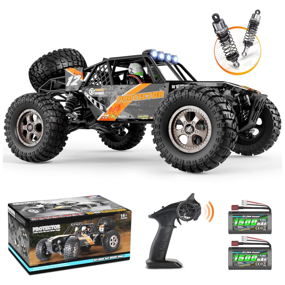 Carro de controle remoto ideal Acelerado por 390 motor e baterias potentes de 7,4 V, este carro RC atinge velocidade de 38 km , he alcance de controle de rádio de 79 metros. Nosso carro de controle remoto Protector permite um tempo de jogo de mais de 30 minutos com duas baterias recarregáveis fornecidas na caixa de presente, um grande caminhão RC ideal para diversão em família em corridas off road.