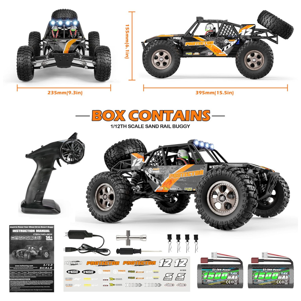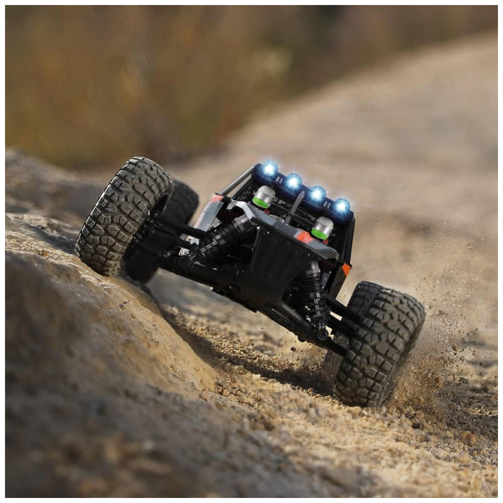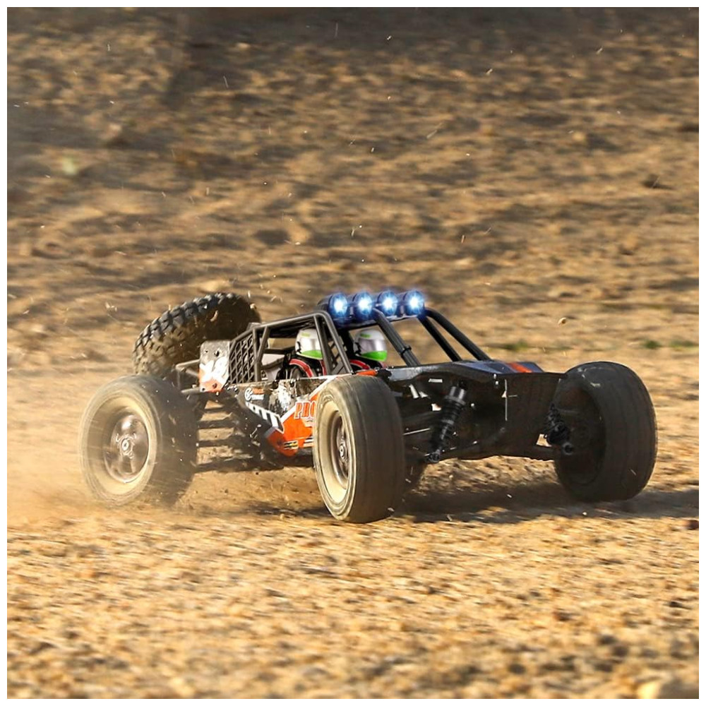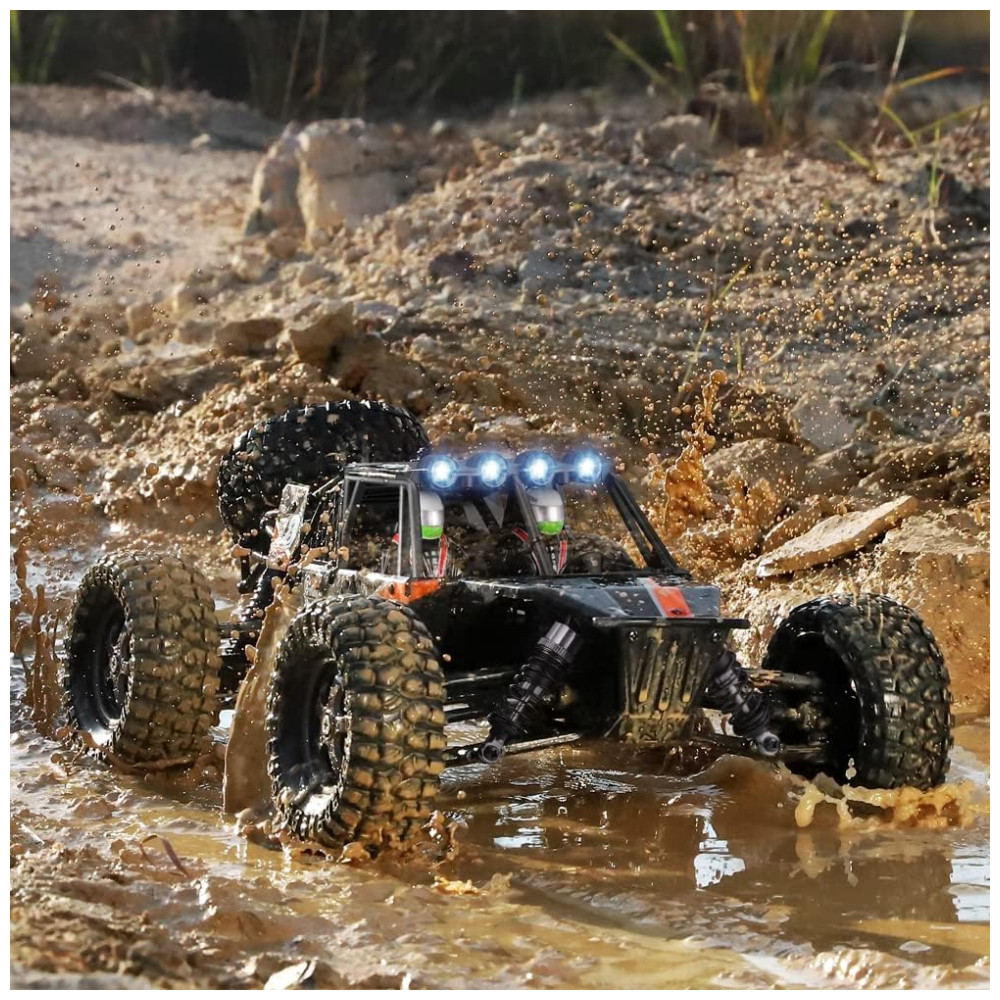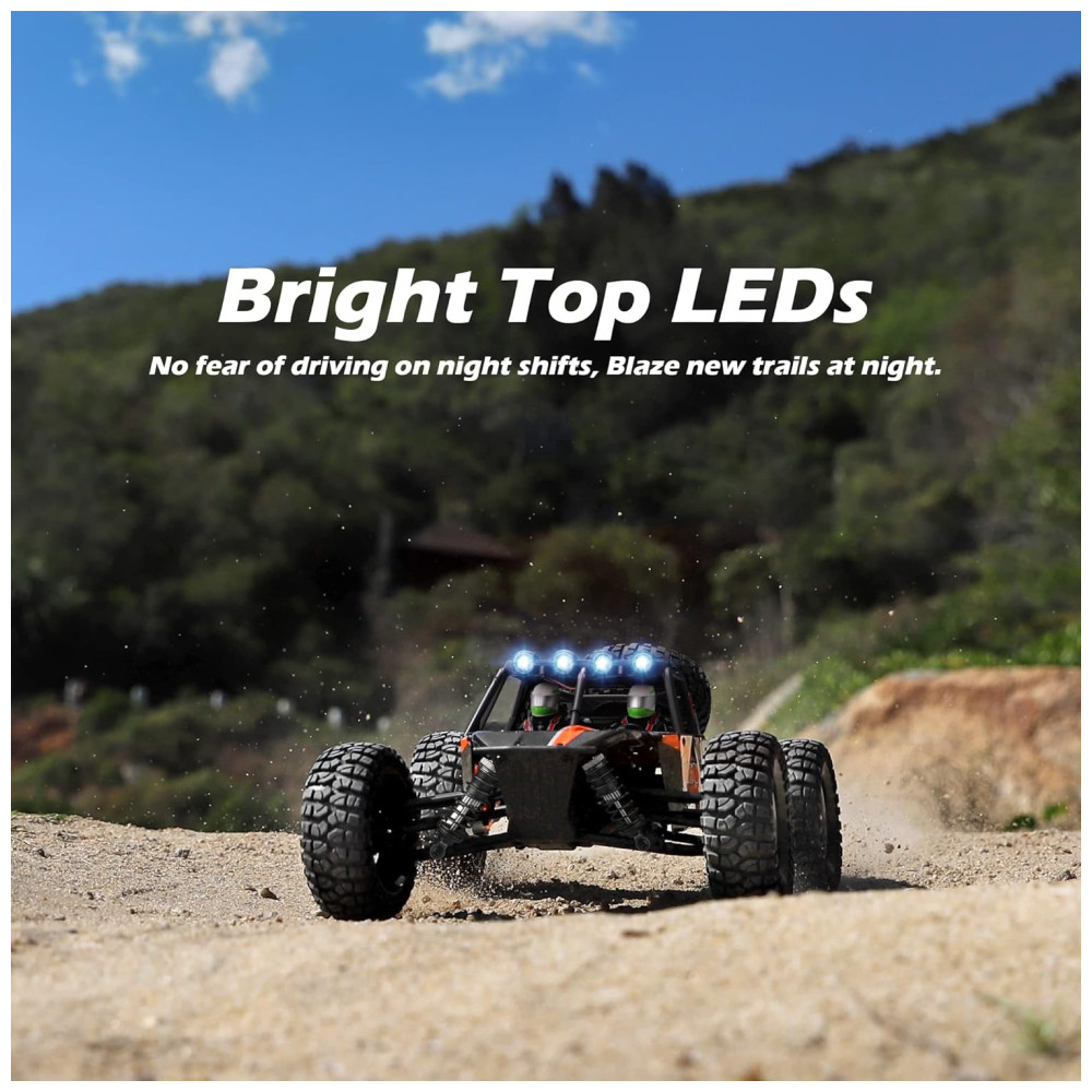 4WD todo o terreno Chassi de tração nas quatro rodas emprega dif. De metal, rolamentos de esferas, pneus de alta aderência, gaiola de proteção em escala real, quatro LEDs superiores e roda sobressalente com os quais faz com que pareçam atraentes rastreadores RC. Areia, superfície de concreto, praias, terrenos on road e off road são todos acessíveis por este buggy RC.