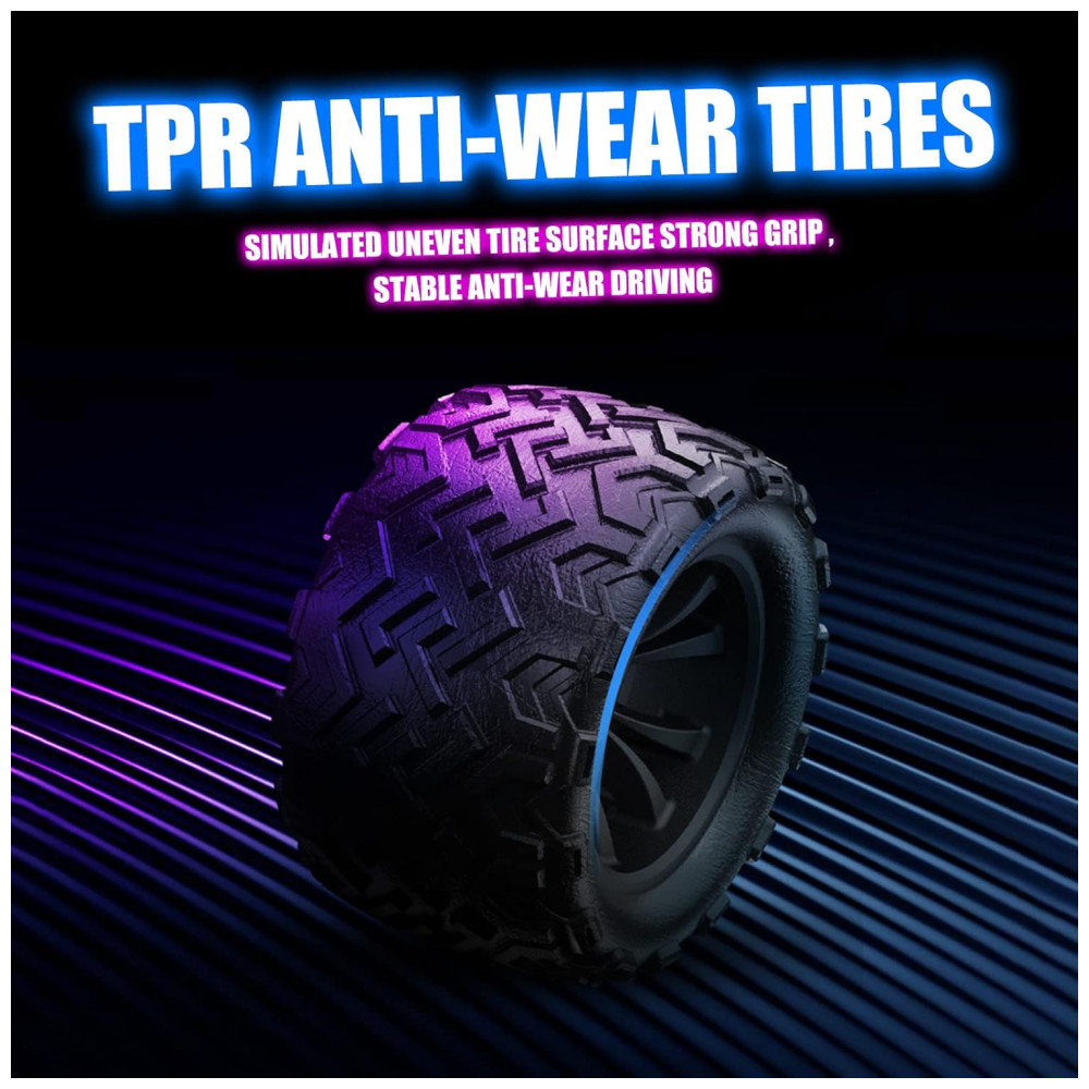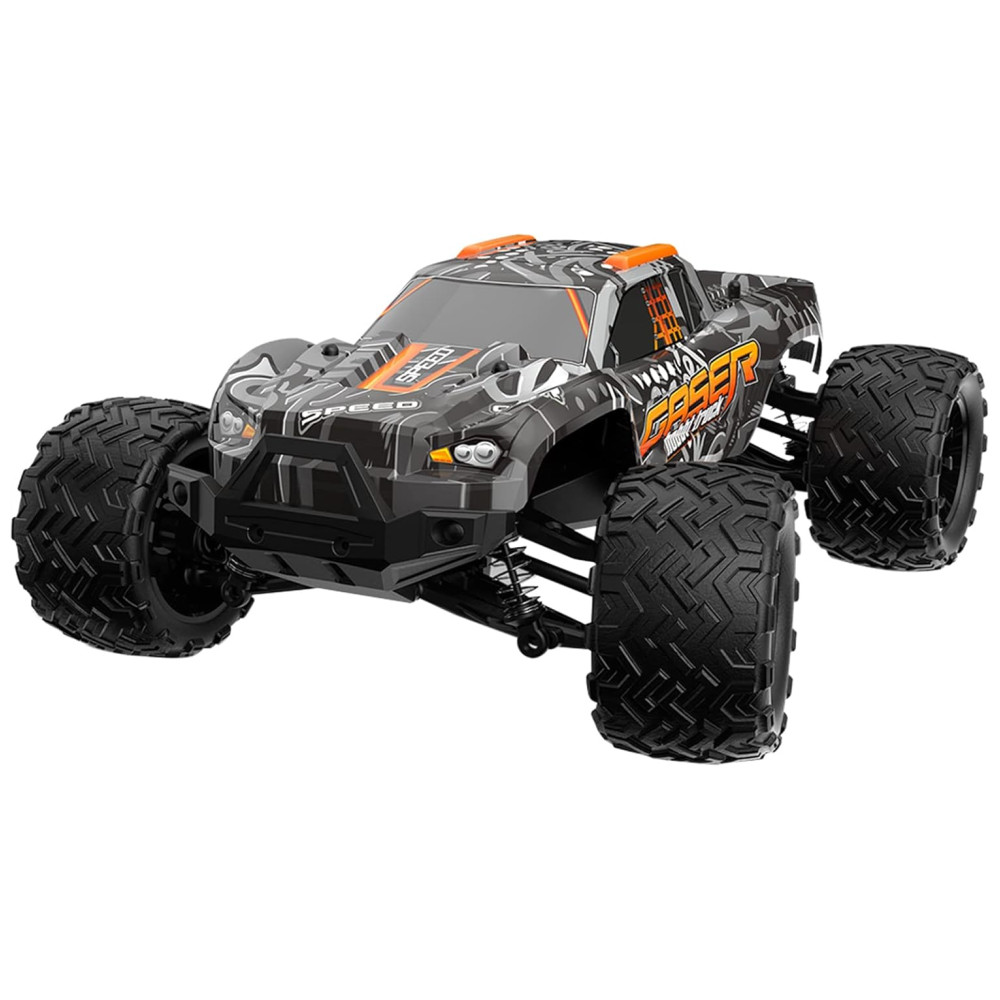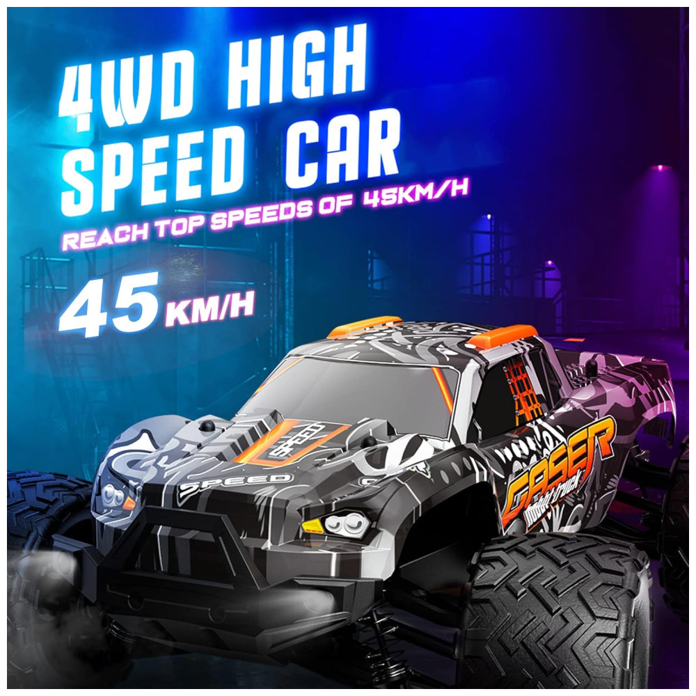 O carro de controle remoto é perfeito para entusiastas de aventuras off-road. Com escala 1:14, ele possui funções como avançar, retroceder, virar à esquerda, virar à direita e freio. Além disso, conta com um sistema de acionamento 4WD e tecnologia 2,4 GHz, o que garante uma resposta rápida e precisa aos comandos. Sua velocidade máxima é de 45 km/h, graças ao motor sem escova de alta eficiência integrado, que converte a energia elétrica em potência ao máximo. As quatro rodas antiderrapantes, conectadas por molas à prova de choque, garantem estabilidade em diversos tipos de terreno, como praia, neve, grama, estrada de montanha e estrada rochosa. Os acessórios atualizados incluem um servo profissional de torque de 17g/2kg, um 2.4G 25A 3 em 1 ESC e diferenciais duplos dianteiro e traseiro.
