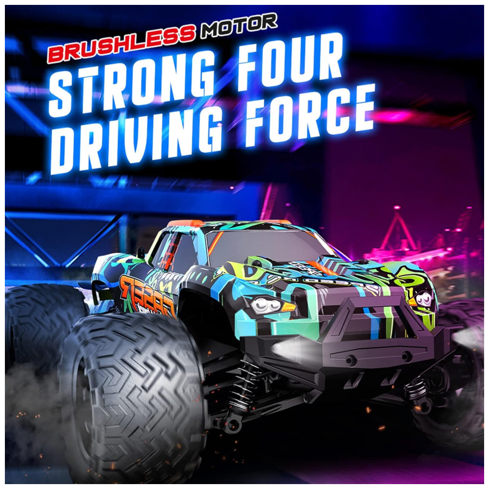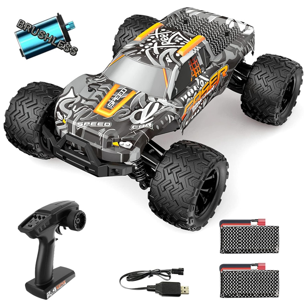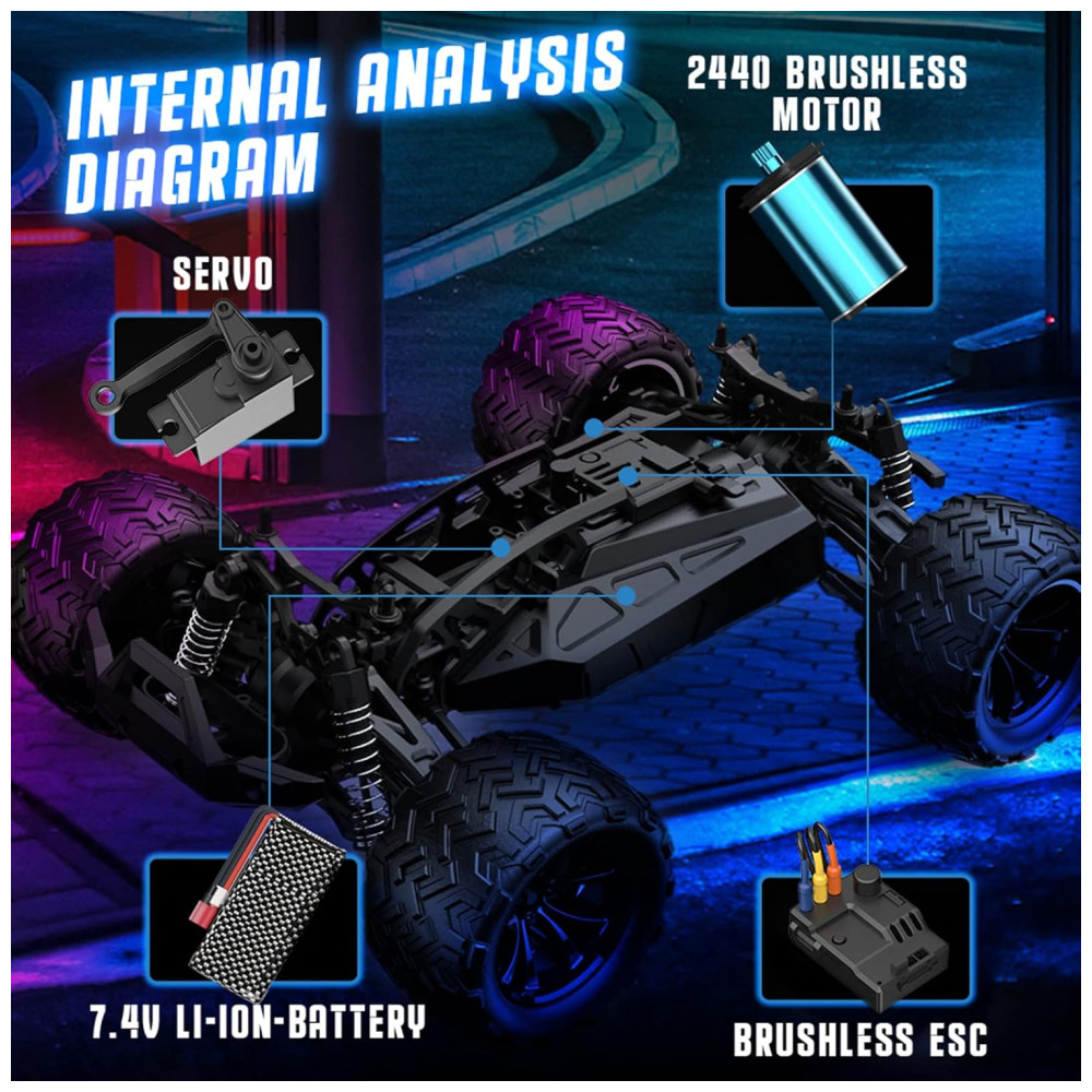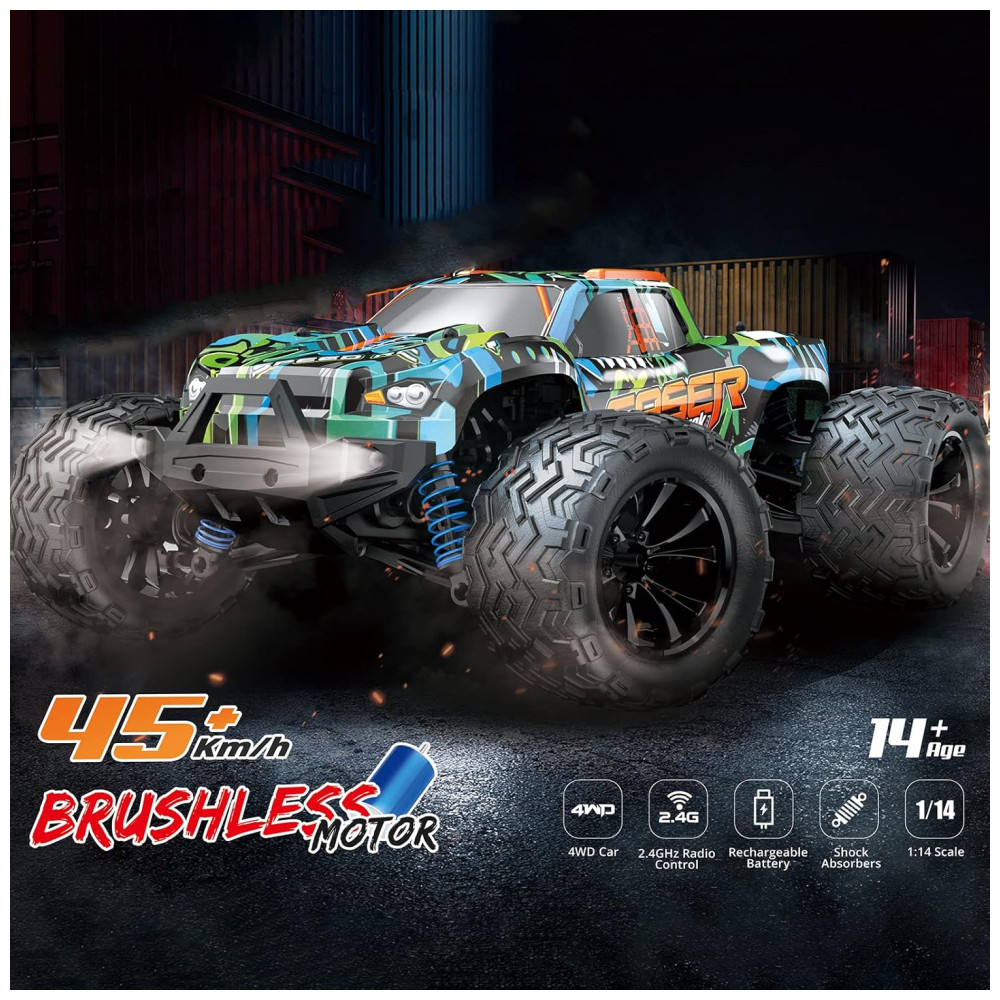 O carro de controle remoto é perfeito para entusiastas de aventuras off-road. Com escala 1:14, ele possui funções como avançar, retroceder, virar à esquerda, virar à direita e freio. Além disso, conta com um sistema de acionamento 4WD e tecnologia 2,4 GHz, o que garante uma resposta rápida e precisa aos comandos. Sua velocidade máxima é de 45 km/h, graças ao motor sem escova de alta eficiência integrado, que converte a energia elétrica em potência ao máximo. As quatro rodas antiderrapantes, conectadas por molas à prova de choque, garantem estabilidade em diversos tipos de terreno, como praia, neve, grama, estrada de montanha e estrada rochosa. Os acessórios atualizados incluem um servo profissional de torque de 17g/2kg, um 2.4G 25A 3 em 1 ESC e diferenciais duplos dianteiro e traseiro.