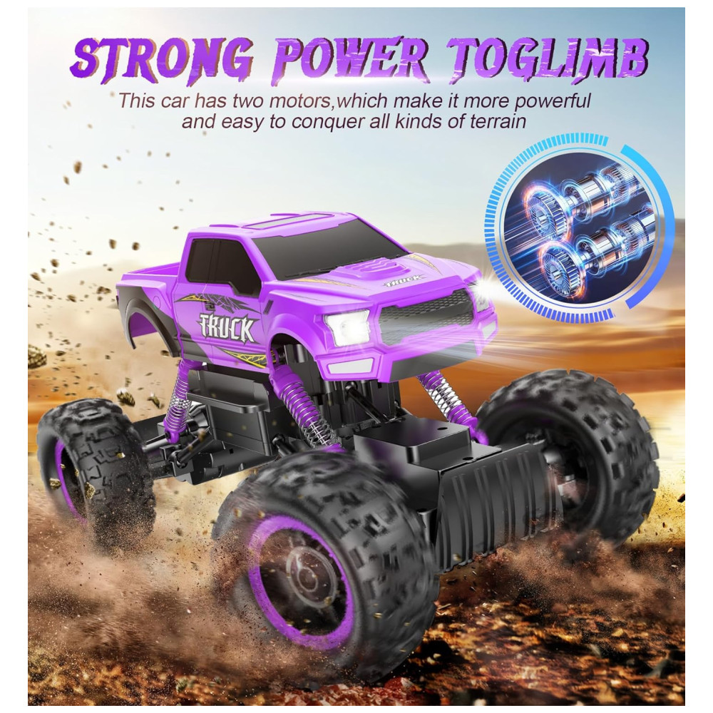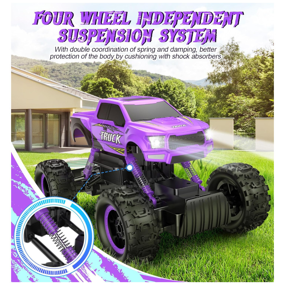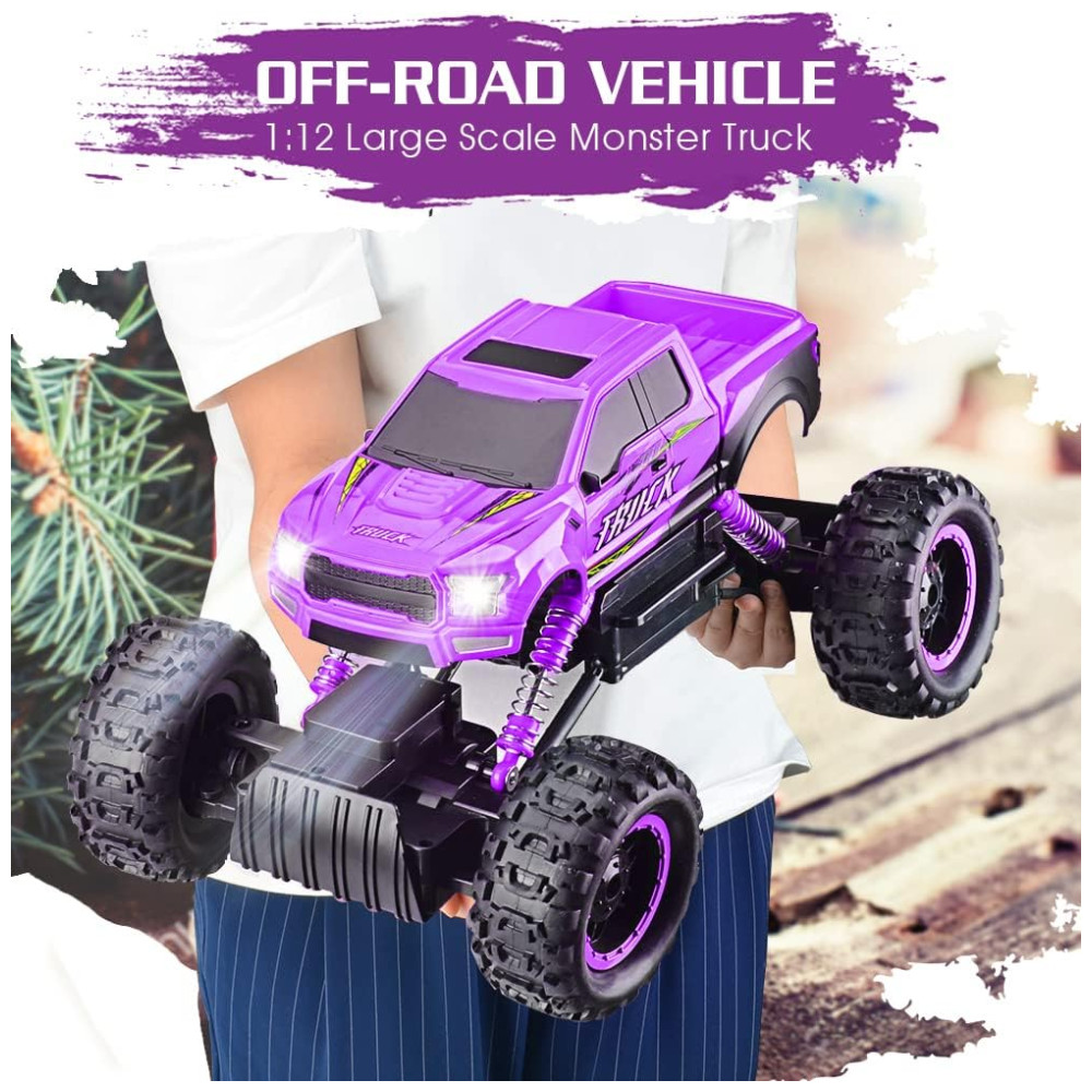 Carrinho de Controle Remoto Off Road Escala 1:12 com Duplo Motor e Luzes para Crianças de 5 a 12 Anos DOUBLE E Monster Truck Roxo