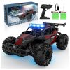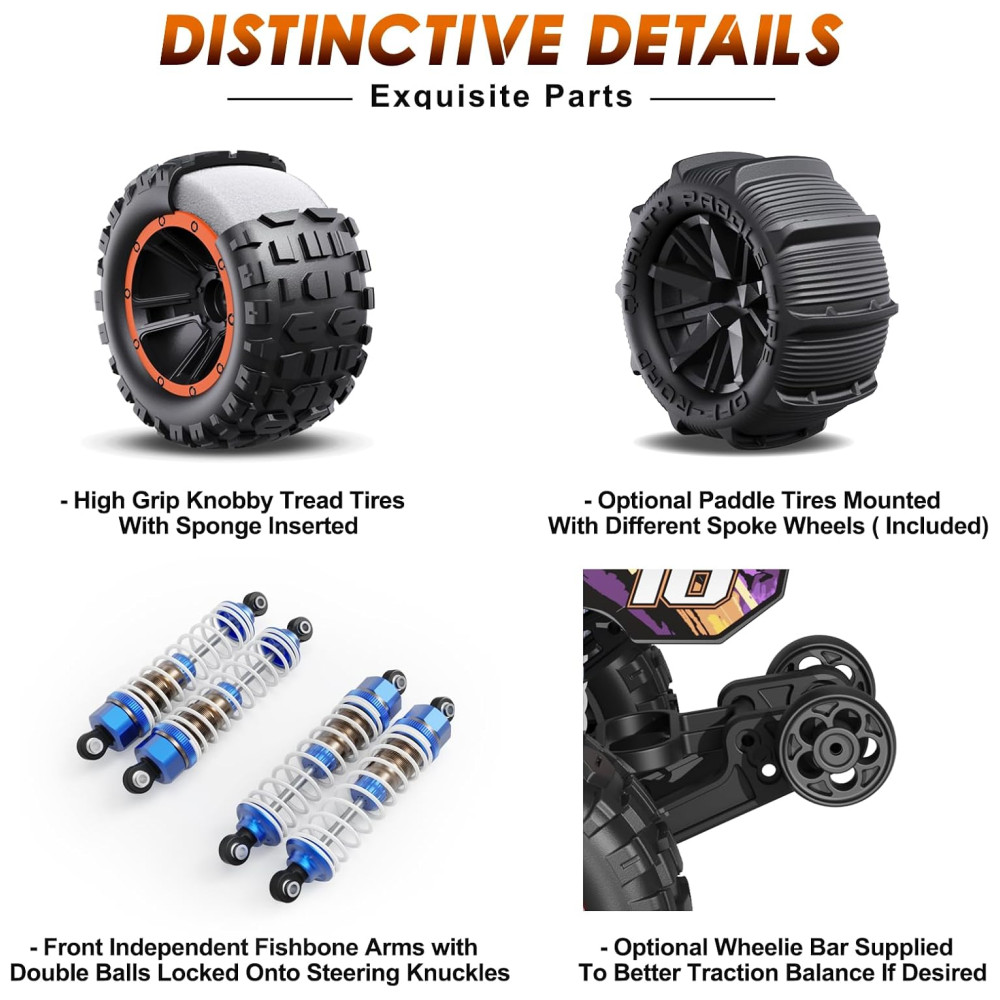 Este caminhão RC sem escovas apresenta uma aparência legal e durabilidade incrível, com corpo de PVC flexível de 1 mm de espessura e decalques DIY animados. Ele vem com pneus offroad com inserção de esponja e pneus de remo opcionais, perfeitos para superfícies com neve e areia. O cavalinho que aumenta a estabilidade durante a partida rápida do veículo é fornecido para uma emoção sem fim.