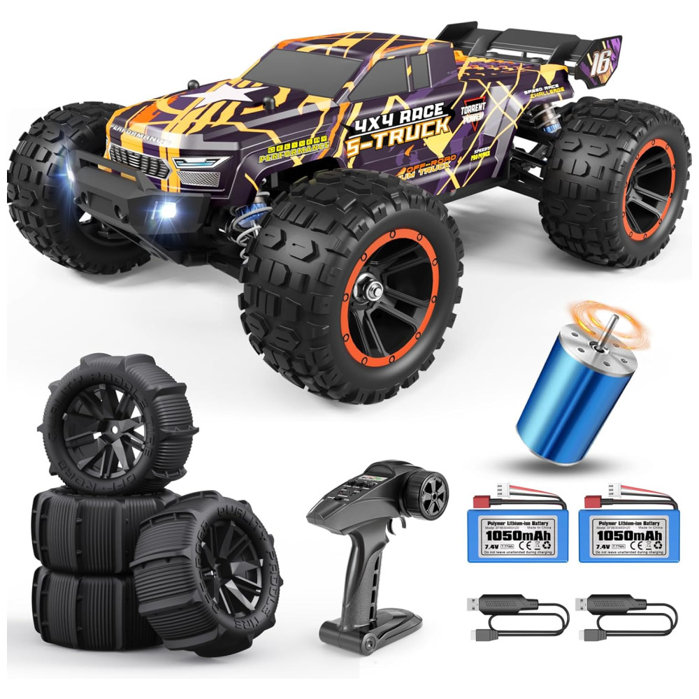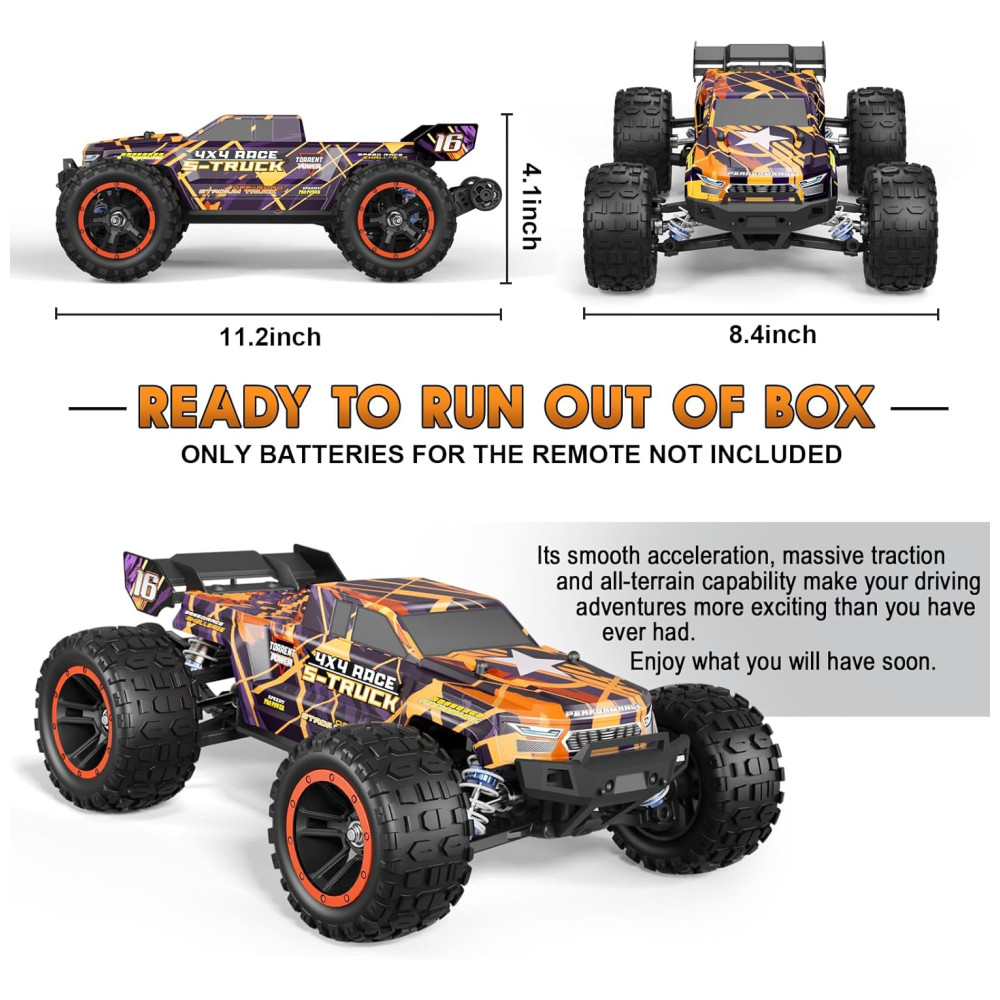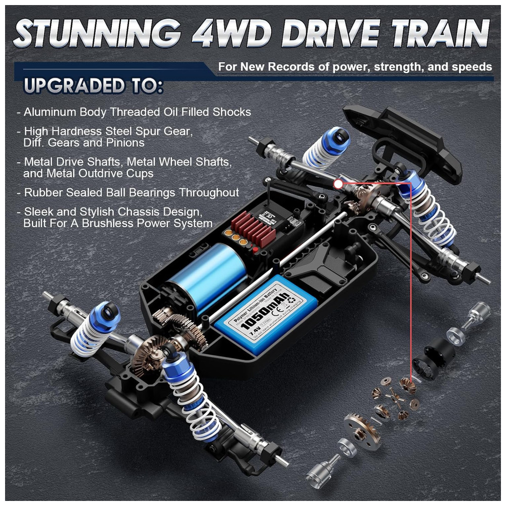 Projetado com um chassi 4WD refinado, suspensão independente dianteira e traseira, amortecedores fullmetal preenchidos com óleo, um servo de direção responsivo de alto torque de 2,2 kg e rolamentos de esferas e pinos de esferas de metal em todo o trem de força e juntas móveis, este carro RC conquistará qualquer terreno à vontade.