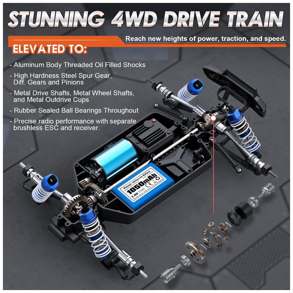 Projetado com um chassi 4WD refinado, suspensão independente dianteira e traseira, amortecedores fullmetal preenchidos com óleo, um servo de direção responsivo de alto torque de 2,2 kg e rolamentos de esferas e pinos de esferas de metal em todo o trem de força e juntas móveis, este carro RC conquistará qualquer terreno à vontade.