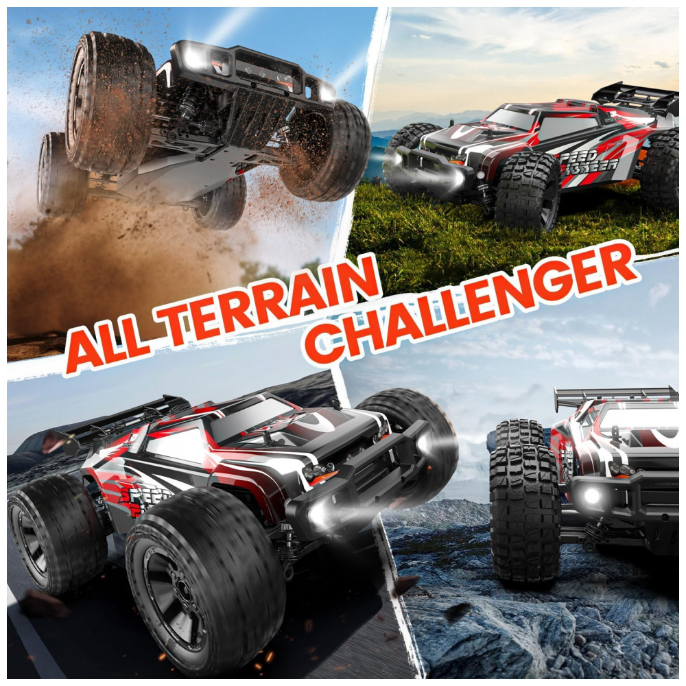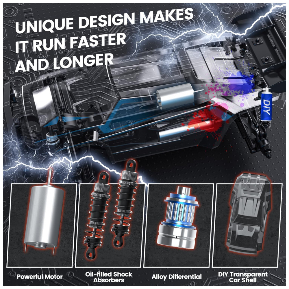 O sistema de controle remoto síncrono de escala completa de 2,4 GHz permite controle proporcional ao acelerador e à velocidade, facilmente ajustável através do interruptor de velocidade e do acabamento da direção. Adequado para usuários iniciantes e avançados, com alcance de até 100,3 metros. As quatro rodas possuem amortecedores cheios de óleo de metal, permitindo condução em todos os terrenos. É um ótimo presente para crianças e adultos, perfeito para corridas em ambientes internos e externos.