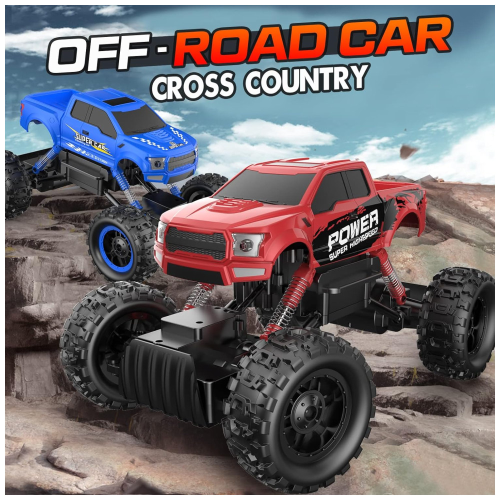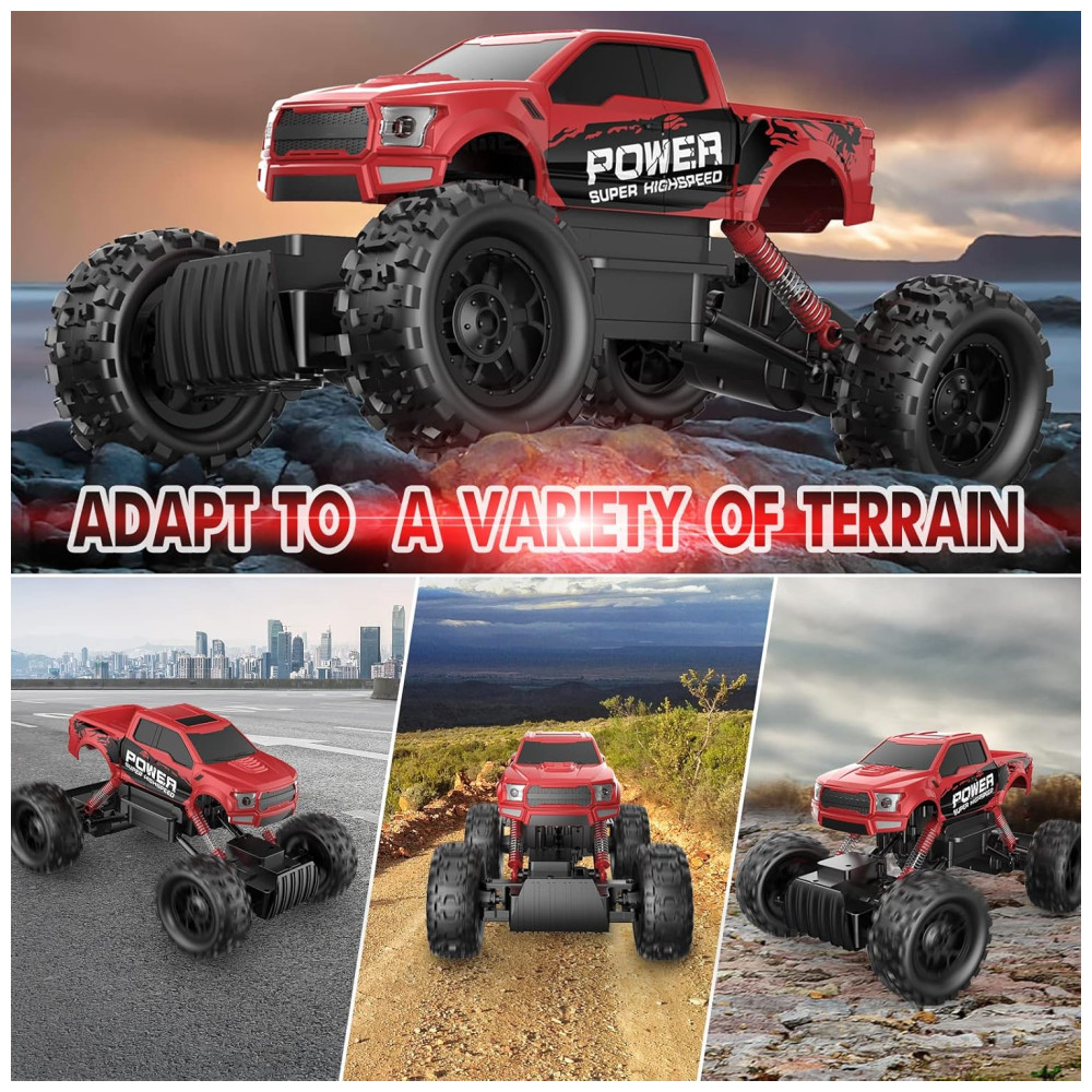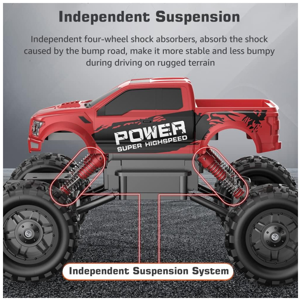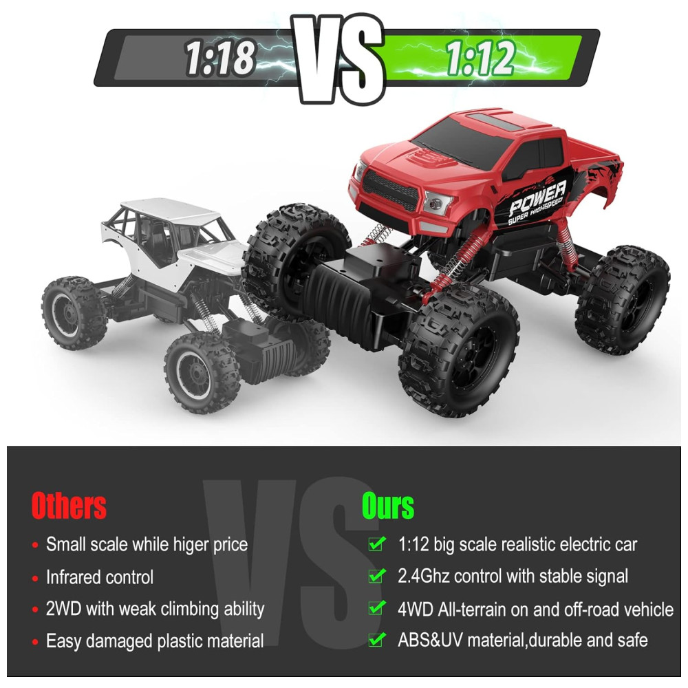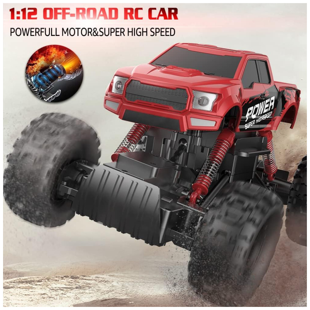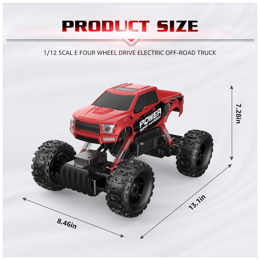 Carrinho de Controle Remoto Off Road Escala 1:12 com Duplo Motor e Luzes para Crianças de 5 a 12 Anos DOUBLE E Monster Truck Vermelho