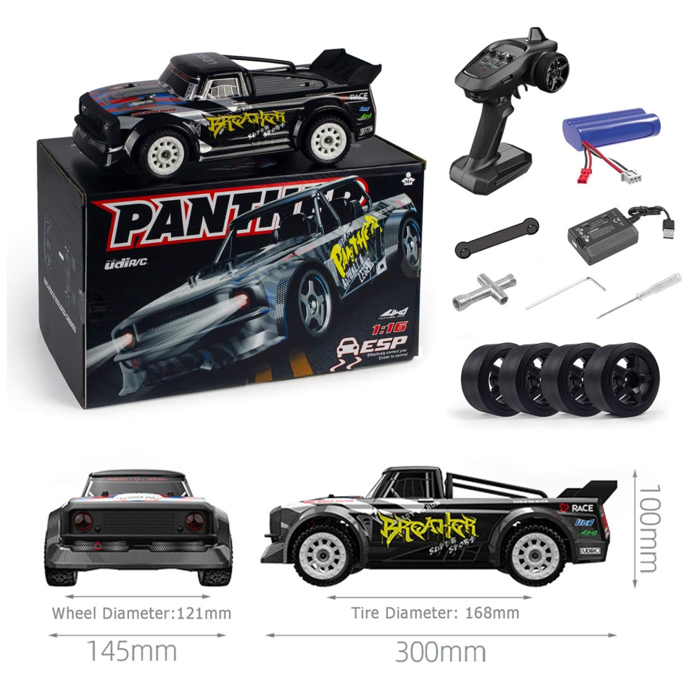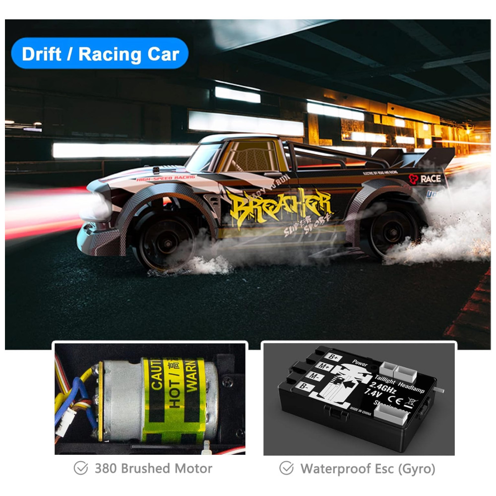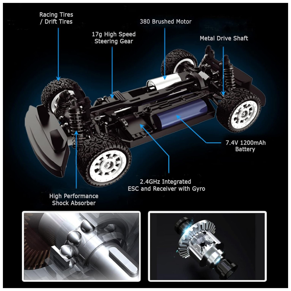 Potente motor escovado 380 Sistema de tração nas quatro rodas 4WD, equipado com motor 380 escovado, direção de alta velocidade 17g, proporcionando tração máxima em todos os terrenos como deserto, rocha, grama, areia ou estrada de concreto, oferece excelente off road desempenho em deriva e corrida.