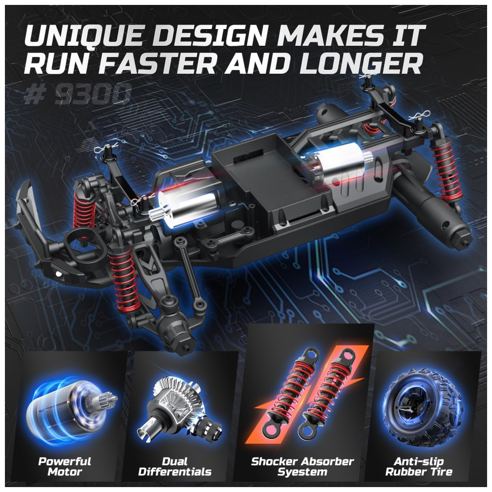 2021 Carro RC de alta velocidade atualizado 118 O carro de controle remoto de alta velocidade 9300 recém atualizado tem pneus maiores e linhas de pneu recém projetadas, o que lhe dá uma aderência mais forte. A folha de metal do cubo bem projetada aumenta a resistência do cubo para evitar a deformação causada pela colisão. Também o equipamos cuidadosamente com uma escova e um bolso com cordão, que o ajudarão a manter o carro RC arrumado e a guardar os acessórios. Tudo o que você precisa para se divertir está na caixa, não hesite em aderir ao DEERC