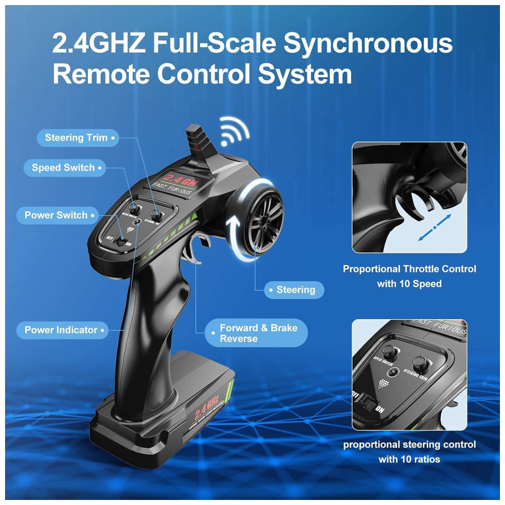 Carro RC Hobby Grade Fato para iniciantes e avançados Equipado com um sistema de controle remoto de 2,4 GHz e pode ser controlado proporcionalmente para aceleração e velocidade. Ajuste o interruptor de velocidade no sentido horário para aumentar a velocidade de direção, no sentido anti horário para diminuir. Ajuste a direção de direção das rodas através do acabamento da direção. Observe que a luz indicadora do controle remoto permanecerá sólida quando o controle remoto e o carro RC forem pareados com sucesso. Ele abre um mundo de aventura e diversão para s pilotos