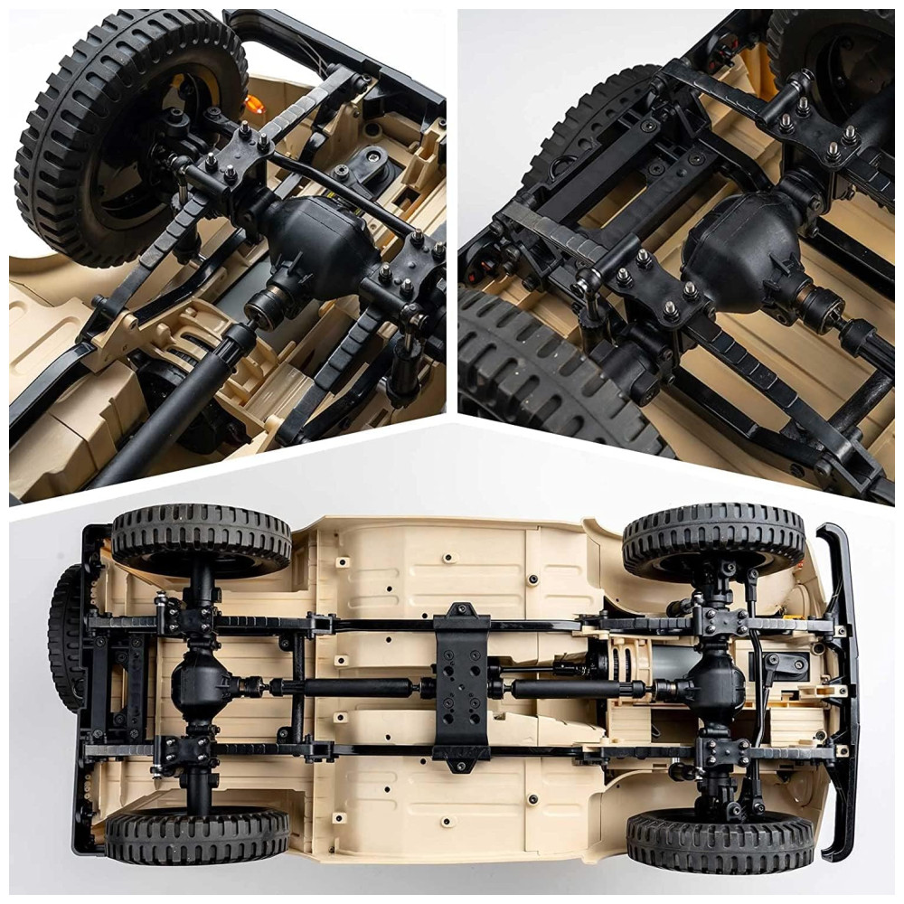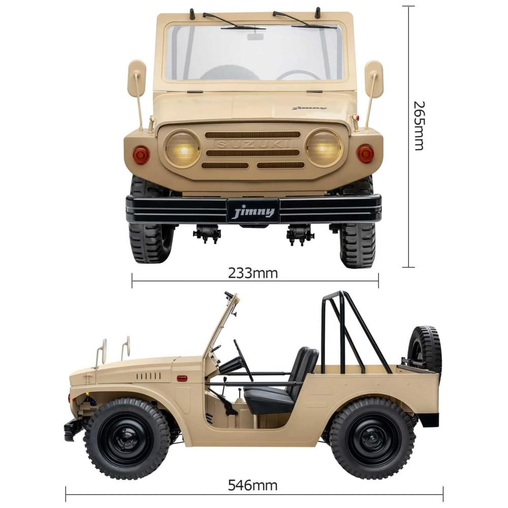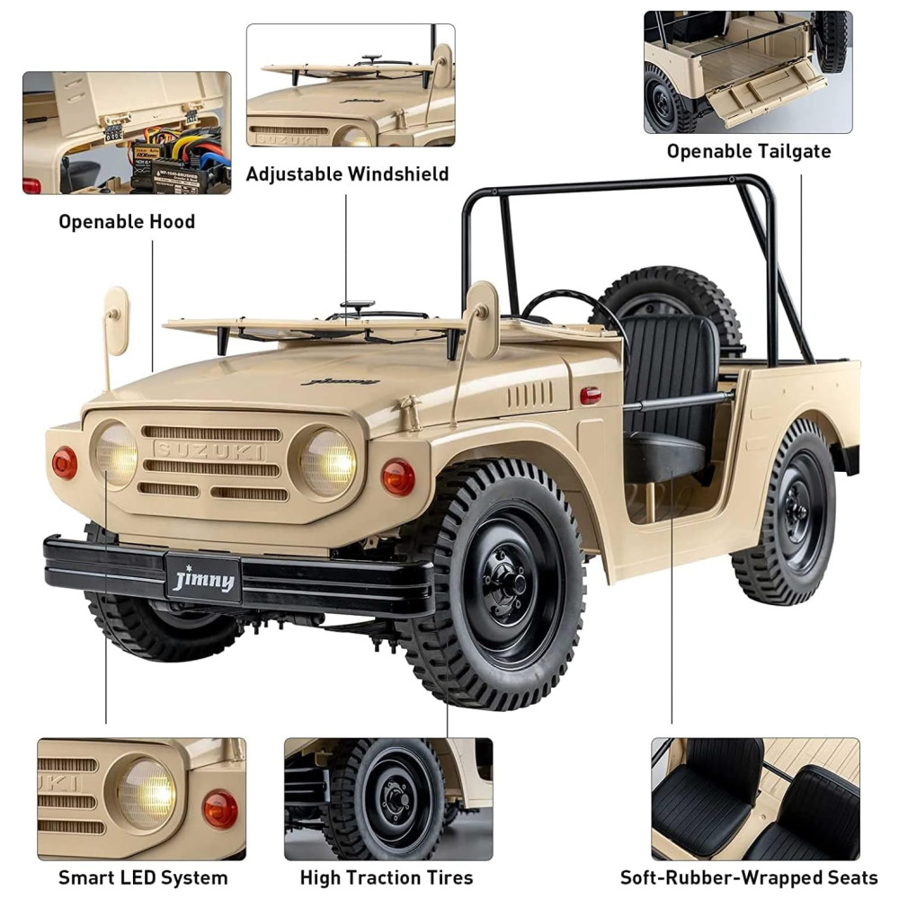 Sistema eletrônico potente e chassi robusto Equipado com motor escovado 550, ESC 40A à prova dágua e receptor de 4 canais, nosso Jimny tem um desempenho poderoso, permitindo lhe atravessar todos os terrenos. Chassis não resistentes, vigas de metal, suspensões de molas dianteiras e traseiras e juntas universais também fazem com que este carro tenha mais estabilidade.