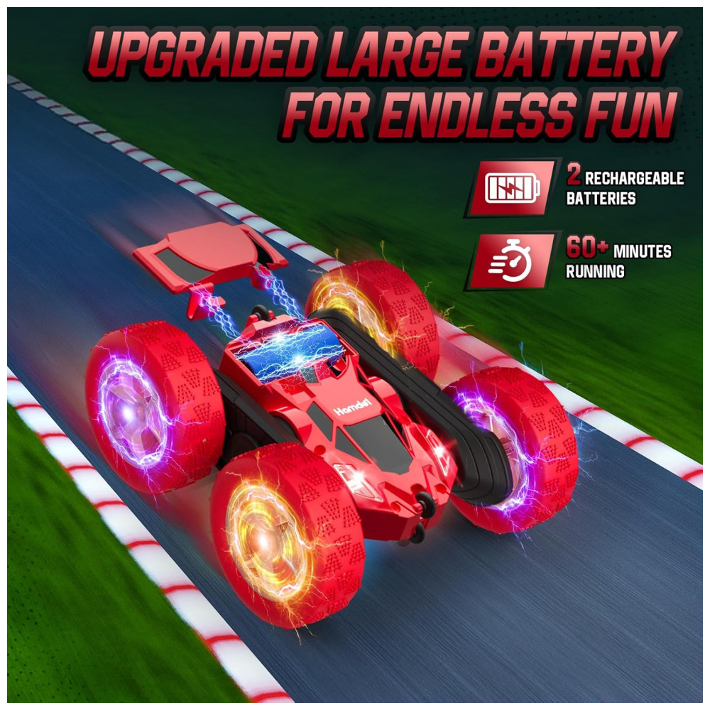 Carrinho de controle remoto Hamdol GLOW Red Fighter, desenvolvido para crianças a partir de 6 anos, com carroceria em plástico ABS resistente a impactos e design em vermelho com linhas aerodinâmicas voltado a uso intenso em acrobacias. A estrutura 4WD e o chassi dupla face permitem condução após capotagens, execução de giros de 360° e rotações contínuas em ambientes internos e externos planos.