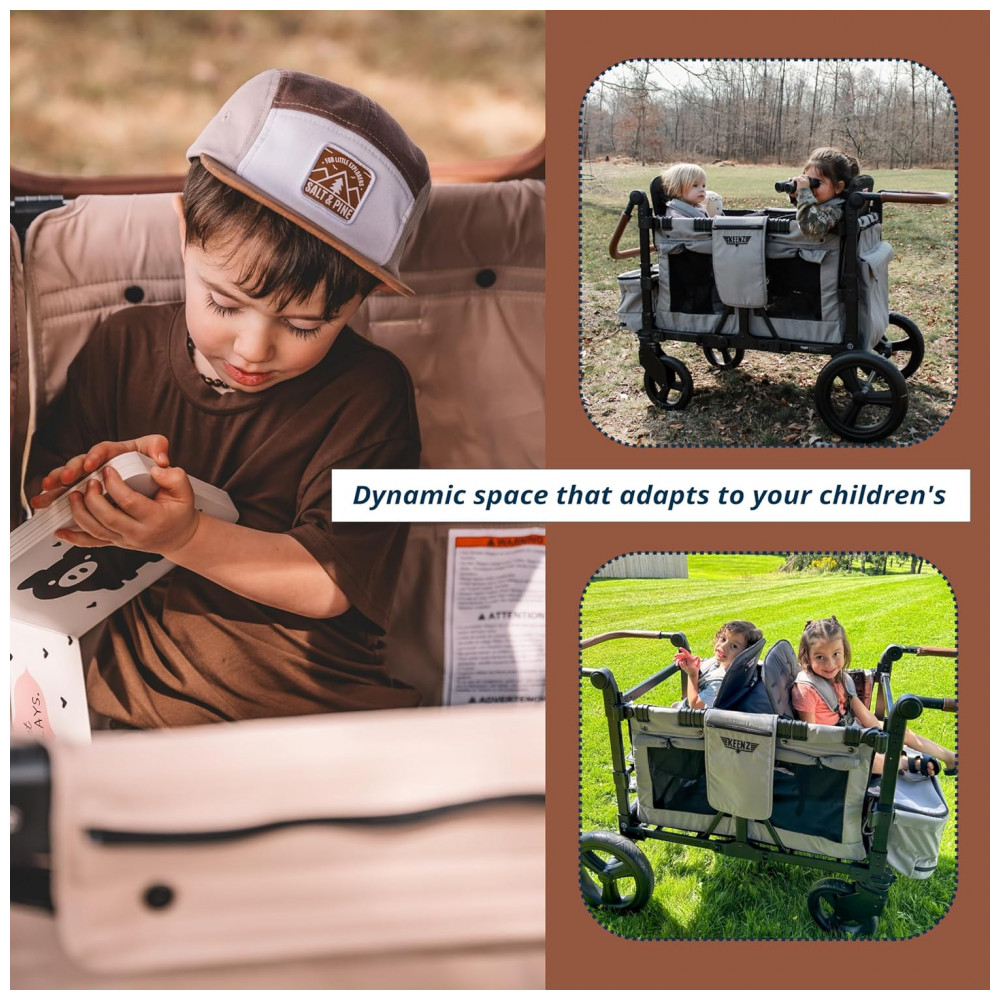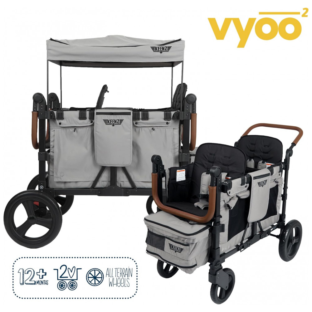 Carrinho de passeio dupla Keenz VYOO cinza acomoda 2 crianças em 5 posições ajustáveis (frente a frente, costas com costas, voltadas para fora), para interações ou explorações em passeios diários. Estrutura em alumínio com rodas todo terreno e dimensões montadas 100 x 57 x 128 cm permite adaptação a superfícies variadas.